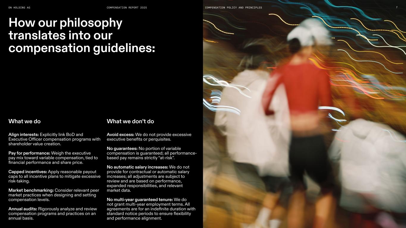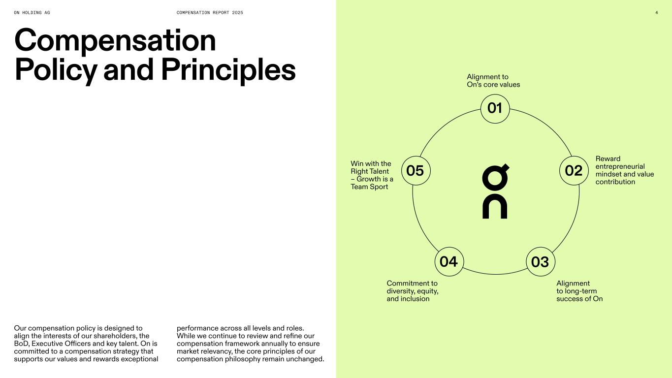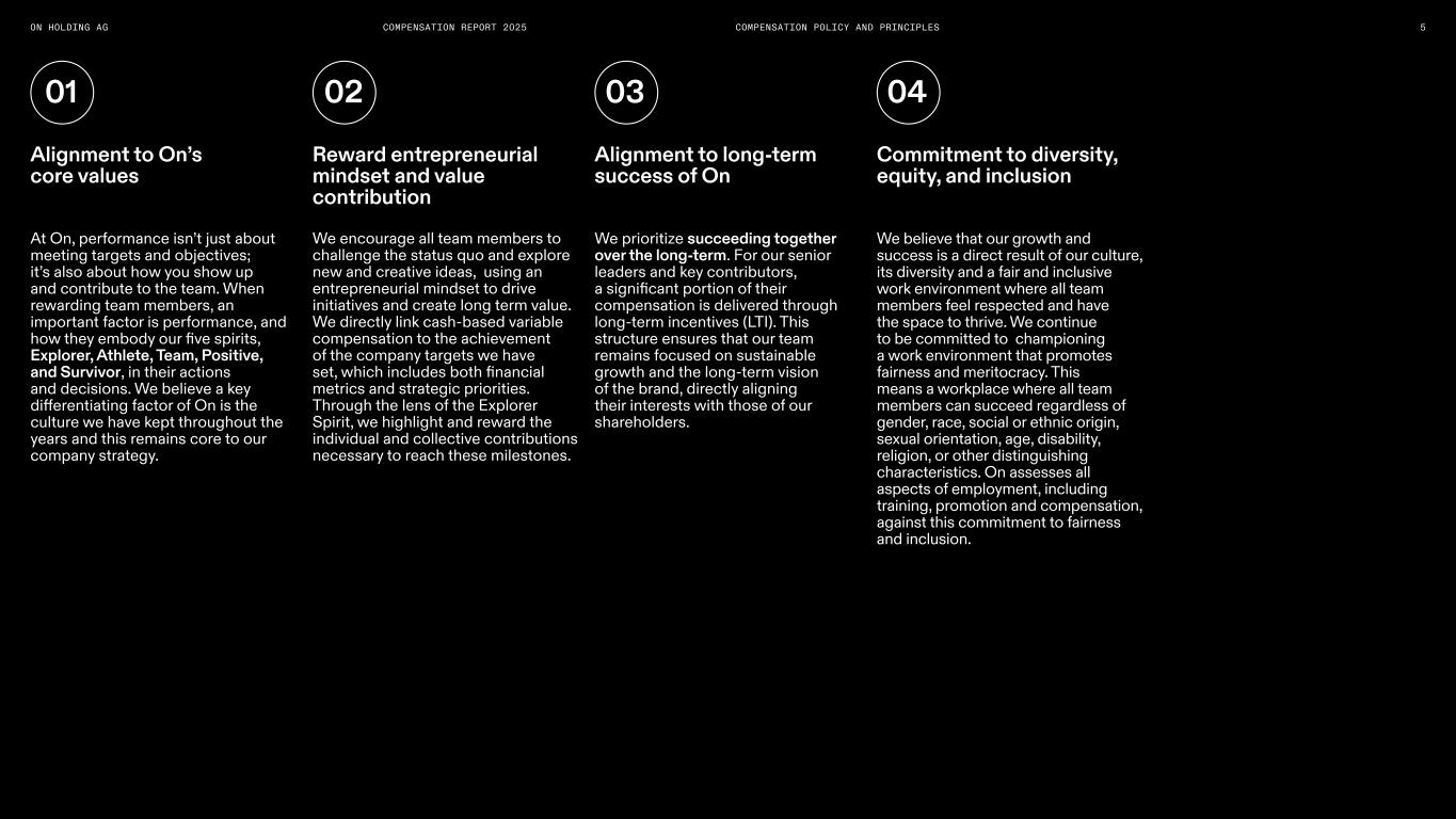XXXXXON HOLDING AG COMPENSATION REPORT 2025 Compensation Policy and Principles Our compensation policy is designed to align the interests of our shareholders, the BoD, Executive Officers and key talent. On is committed to a compensation strategy that supports our values and rewards exceptional 4 Alignment to On’s core values Reward entrepreneurial mindset and value contribution Alignment to long-term success of On Commitment to diversity, equity, and inclusion Win with the Right Talent – Growth is a Team Sport 05 04 03 02 01 performance across all levels and roles. While we continue to review and refine our compensation framework annually to ensure market relevancy, the core principles of our compensation philosophy remain unchanged.