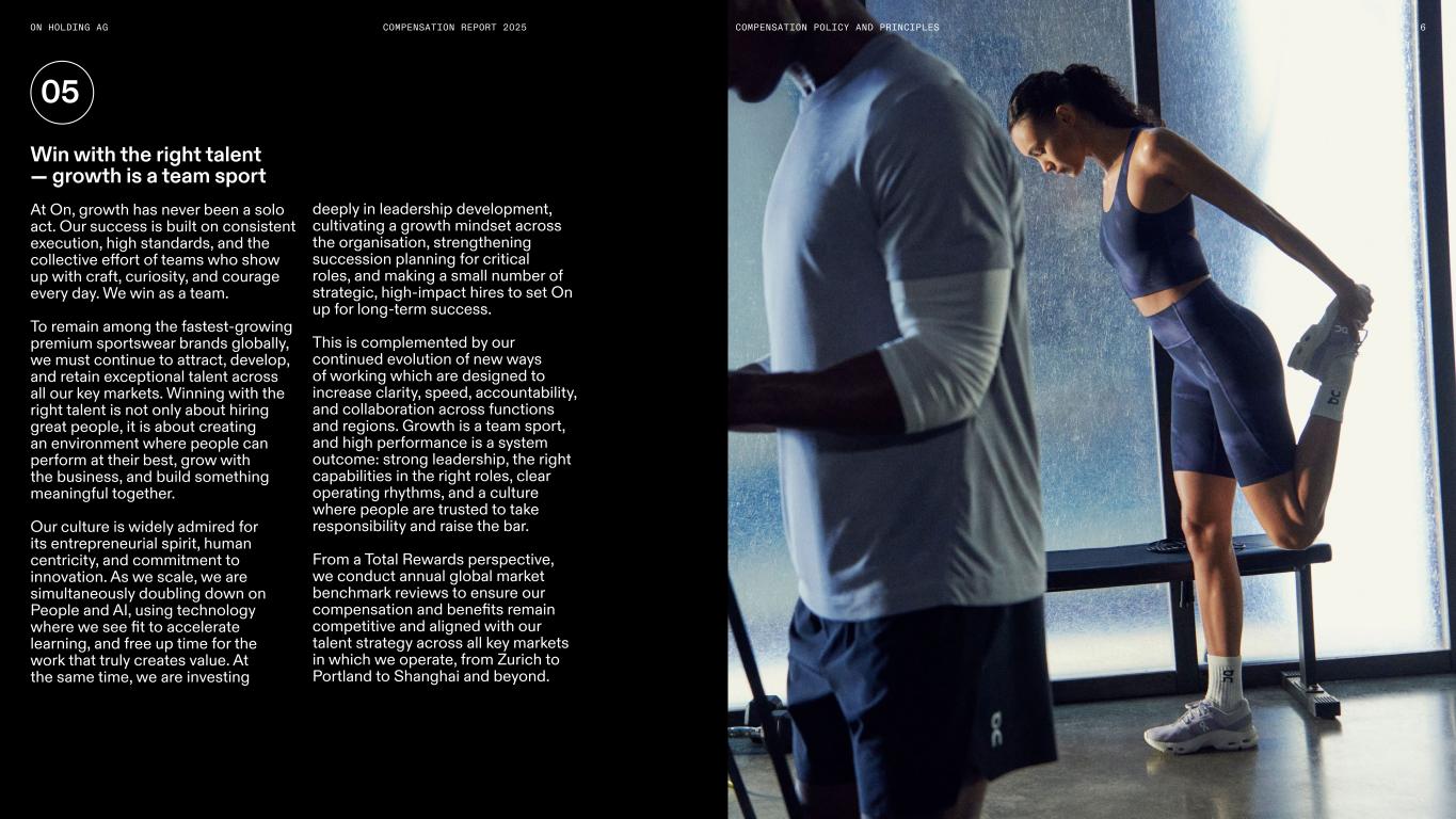 5ON HOLDING AG COMPENSATION REPORT 2025 At On, performance isn’t just about meeting targets and objectives; it’s also about how you show up and contribute to the team. When rewarding team members, an important factor is performance, and how they embody our five spirits, Explorer, Athlete, Team, Positive, and Survivor, in their actions and decisions. We believe a key differentiating factor of On is the culture we have kept throughout the years and this remains core to our company strategy. Alignment to On’s core values Reward entrepreneurial mindset and value contribution Alignment to long-term success of On Commitment to diversity, equity, and inclusion We encourage all team members to challenge the status quo and explore new and creative ideas, using an entrepreneurial mindset to drive initiatives and create long term value. We directly link cash-based variable compensation to the achievement of the company targets we have set, which includes both financial metrics and strategic priorities. Through the lens of the Explorer Spirit, we highlight and reward the individual and collective contributions necessary to reach these milestones. We prioritize succeeding together over the long-term. For our senior leaders and key contributors, a significant portion of their compensation is delivered through long-term incentives (LTI). This structure ensures that our team remains focused on sustainable growth and the long-term vision of the brand, directly aligning their interests with those of our shareholders. We believe that our growth and success is a direct result of our culture, its diversity and a fair and inclusive work environment where all team members feel respected and have the space to thrive. We continue to be committed to championing a work environment that promotes fairness and meritocracy. This means a workplace where all team members can succeed regardless of gender, race, social or ethnic origin, sexual orientation, age, disability, religion, or other distinguishing characteristics. On assesses all aspects of employment, including training, promotion and compensation, against this commitment to fairness and inclusion. COMPENSATION POLICY AND PRINCIPLES 04030201