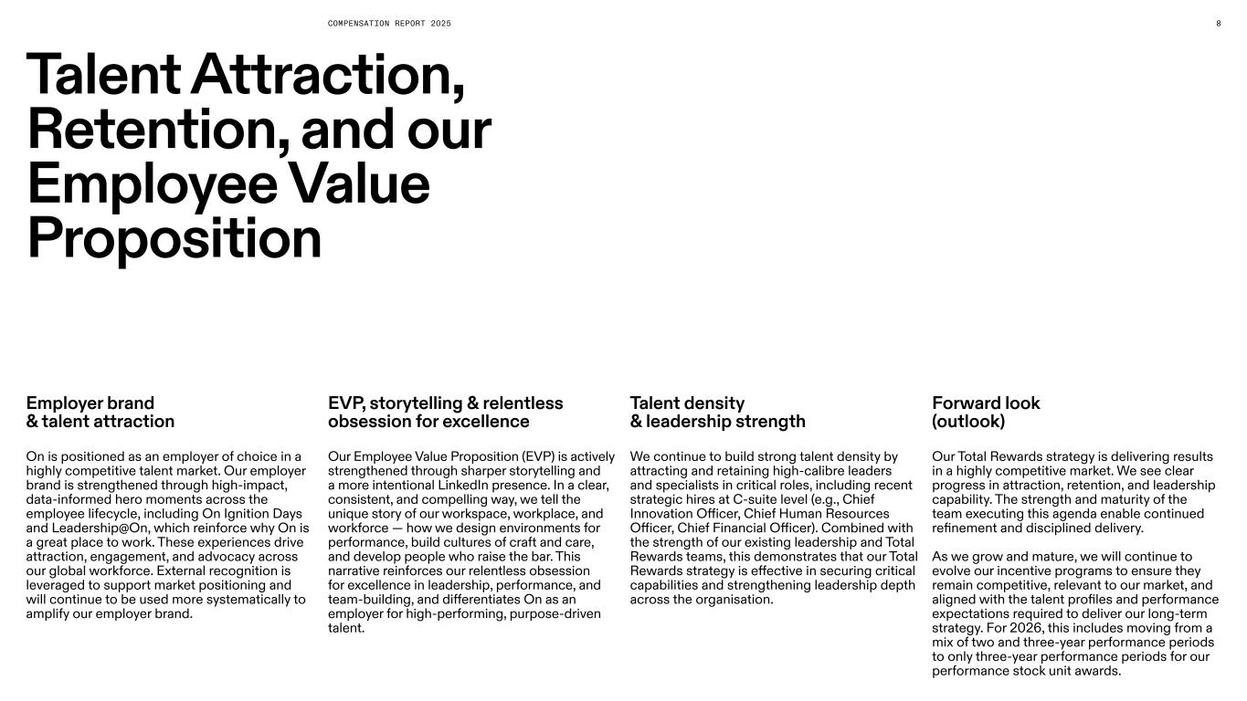 COMPENSATION REPORT 2025 Talent Attraction, Retention, and our Employee Value Proposition 8 Employer brand & talent attraction On is positioned as an employer of choice in a highly competitive talent market. Our employer brand is strengthened through high-impact, data-informed hero moments across the employee lifecycle, including On Ignition Days and Leadership@On, which reinforce why On is a great place to work. These experiences drive attraction, engagement, and advocacy across our global workforce. External recognition is leveraged to support market positioning and will continue to be used more systematically to amplify our employer brand. EVP, storytelling & relentless obsession for excellence Our Employee Value Proposition (EVP) is actively strengthened through sharper storytelling and a more intentional LinkedIn presence. In a clear, consistent, and compelling way, we tell the unique story of our workspace, workplace, and workforce — how we design environments for performance, build cultures of craft and care, and develop people who raise the bar. This narrative reinforces our relentless obsession for excellence in leadership, performance, and team-building, and differentiates On as an employer for high-performing, purpose-driven talent. Talent density & leadership strength We continue to build strong talent density by attracting and retaining high-calibre leaders and specialists in critical roles, including recent strategic hires at C-suite level (e.g., Chief Innovation Officer, Chief Human Resources Officer, Chief Financial Officer). Combined with the strength of our existing leadership and Total Rewards teams, this demonstrates that our Total Rewards strategy is effective in securing critical capabilities and strengthening leadership depth across the organisation. Forward look (outlook) Our Total Rewards strategy is delivering results in a highly competitive market. We see clear progress in attraction, retention, and leadership capability. The strength and maturity of the team executing this agenda enable continued refinement and disciplined delivery. As we grow and mature, we will continue to evolve our incentive programs to ensure they remain competitive, relevant to our market, and aligned with the talent profiles and performance expectations required to deliver our long-term strategy. For 2026, this includes moving from a mix of two and three-year performance periods to only three-year performance periods for our performance stock unit awards.