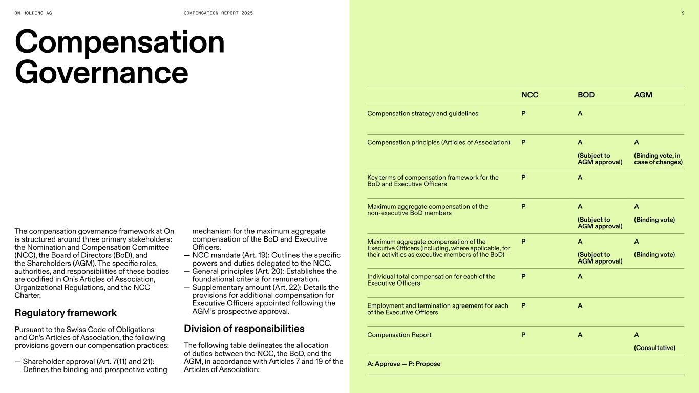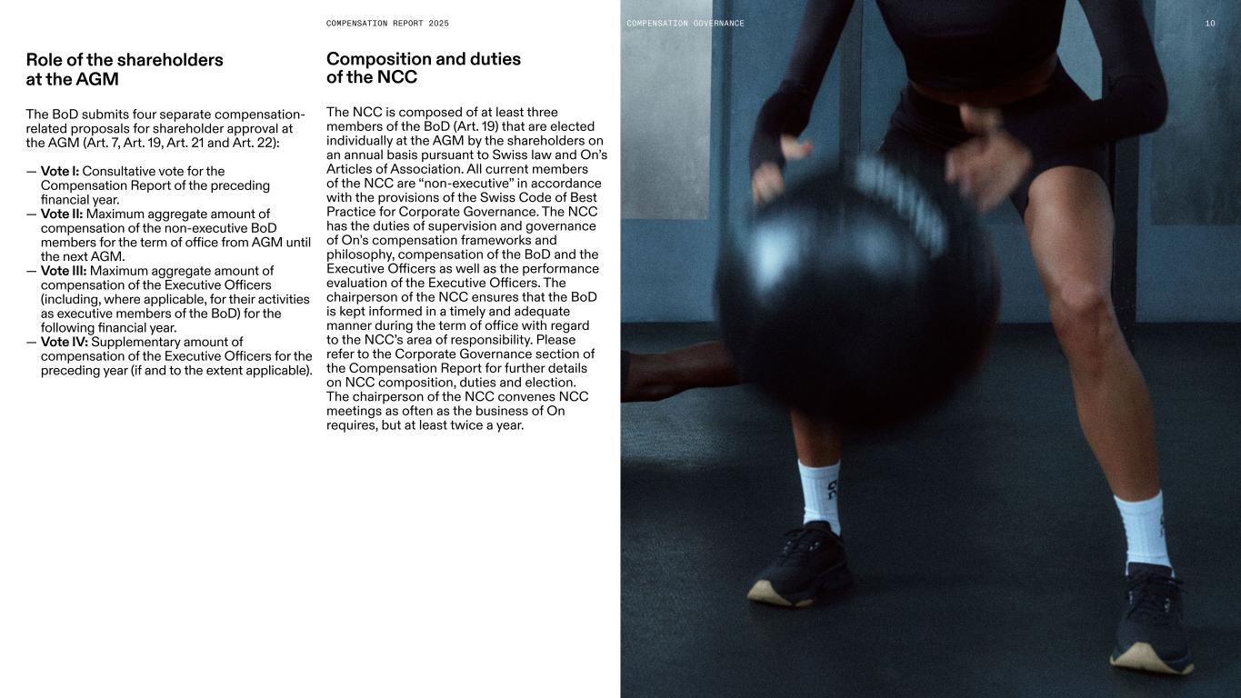 COMPENSATION REPORT 2025 Role of the shareholders at the AGM The BoD submits four separate compensation- related proposals for shareholder approval at the AGM (Art. 7, Art. 19, Art. 21 and Art. 22): — Vote I: Consultative vote for the Compensation Report of the preceding financial year. — Vote II: Maximum aggregate amount of compensation of the non-executive BoD members for the term of office from AGM until the next AGM. — Vote III: Maximum aggregate amount of compensation of the Executive Officers (including, where applicable, for their activities as executive members of the BoD) for the following financial year. — Vote IV: Supplementary amount of compensation of the Executive Officers for the preceding year (if and to the extent applicable). Composition and duties of the NCC The NCC is composed of at least three members of the BoD (Art. 19) that are elected individually at the AGM by the shareholders on an annual basis pursuant to Swiss law and On’s Articles of Association. All current members of the NCC are “non-executive” in accordance with the provisions of the Swiss Code of Best Practice for Corporate Governance. The NCC has the duties of supervision and governance of On’s compensation frameworks and philosophy, compensation of the BoD and the Executive Officers as well as the performance evaluation of the Executive Officers. The chairperson of the NCC ensures that the BoD is kept informed in a timely and adequate manner during the term of office with regard to the NCC’s area of responsibility. Please refer to the Corporate Governance section of the Compensation Report for further details on NCC composition, duties and election. The chairperson of the NCC convenes NCC meetings as often as the business of On requires, but at least twice a year. 10COMPENSATION GOVERNANCE