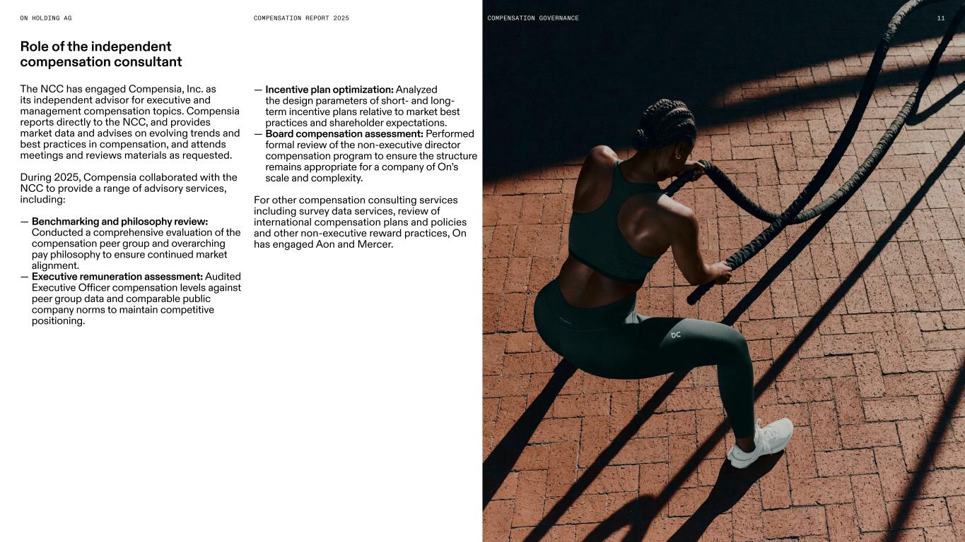 COMPENSATION REPORT 2025ON HOLDING AG Role of the independent compensation consultant The NCC has engaged Compensia, Inc. as its independent advisor for executive and management compensation topics. Compensia reports directly to the NCC, and provides market data and advises on evolving trends and best practices in compensation, and attends meetings and reviews materials as requested. During 2025, Compensia collaborated with the NCC to provide a range of advisory services, including: — Benchmarking and philosophy review: Conducted a comprehensive evaluation of the compensation peer group and overarching pay philosophy to ensure continued market alignment. — Executive remuneration assessment: Audited Executive Officer compensation levels against peer group data and comparable public company norms to maintain competitive positioning. — Incentive plan optimization: Analyzed the design parameters of short- and long- term incentive plans relative to market best practices and shareholder expectations. — Board compensation assessment: Performed formal review of the non-executive director compensation program to ensure the structure remains appropriate for a company of On’s scale and complexity. For other compensation consulting services including survey data services, review of international compensation plans and policies and other non-executive reward practices, On has engaged Aon and Mercer. 11COMPENSATION GOVERNANCE