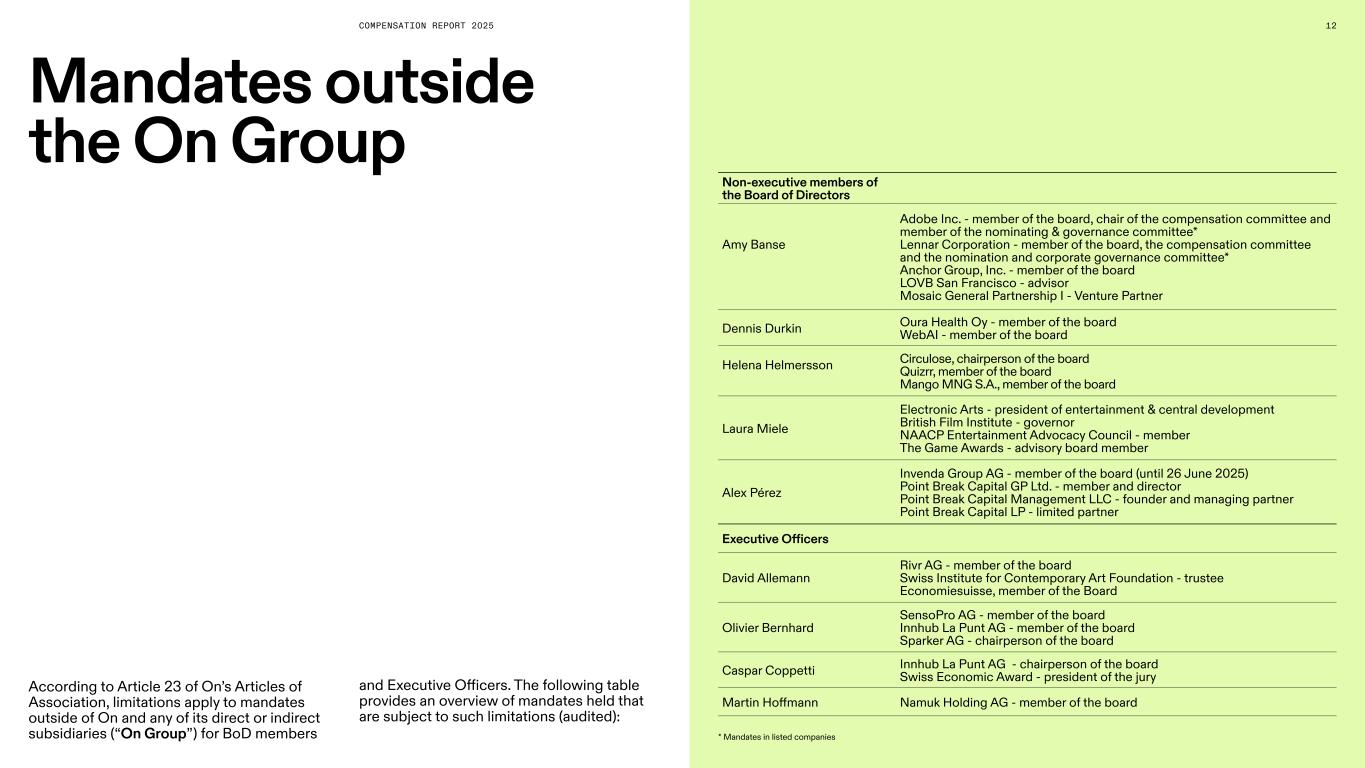 COMPENSATION REPORT 2025 12 Mandates outside the On Group According to Article 23 of On’s Articles of Association, limitations apply to mandates outside of On and any of its direct or indirect subsidiaries (“On Group”) for BoD members Non-executive members of the Board of Directors Amy Banse Adobe Inc. - member of the board, chair of the compensation committee and member of the nominating & governance committee* Lennar Corporation - member of the board, the compensation committee and the nomination and corporate governance committee* Anchor Group, Inc. - member of the board LOVB San Francisco - advisor Mosaic General Partnership I - Venture Partner Dennis Durkin Oura Health Oy - member of the board WebAI - member of the board Helena Helmersson Circulose, chairperson of the board Quizrr, member of the board Mango MNG S.A., member of the board Laura Miele Electronic Arts - president of entertainment & central development British Film Institute - governor NAACP Entertainment Advocacy Council - member The Game Awards - advisory board member Alex Pérez Invenda Group AG - member of the board (until 26 June 2025) Point Break Capital GP Ltd. - member and director Point Break Capital Management LLC - founder and managing partner Point Break Capital LP - limited partner Executive Officers David Allemann Rivr AG - member of the board Swiss Institute for Contemporary Art Foundation - trustee Economiesuisse, member of the Board Olivier Bernhard SensoPro AG - member of the board Innhub La Punt AG - member of the board Sparker AG - chairperson of the board Caspar Coppetti Innhub La Punt AG - chairperson of the board Swiss Economic Award - president of the jury Martin Hoffmann Namuk Holding AG - member of the board * Mandates in listed companies and Executive Officers. The following table provides an overview of mandates held that are subject to such limitations (audited):