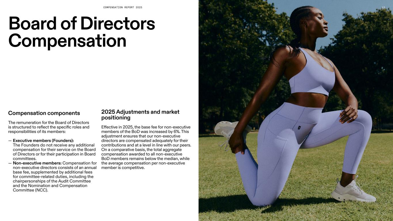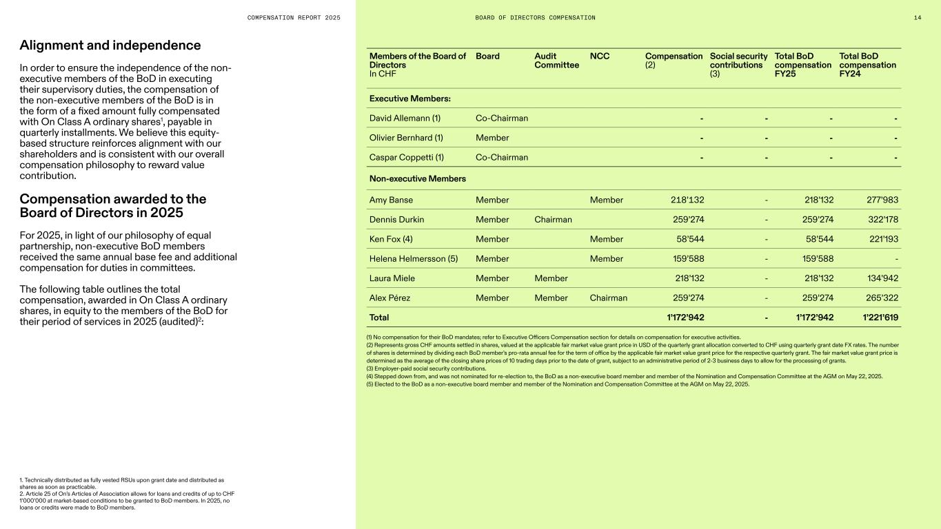 COMPENSATION REPORT 2025 BOARD OF DIRECTORS COMPENSATION Members of the Board of Directors In CHF Board Audit Committee NCC Compensation (2) Social security contributions (3) Total BoD compensation FY25 Total BoD compensation FY24 Executive Members: David Allemann (1) Co-Chairman - - - - Olivier Bernhard (1) Member - - - - Caspar Coppetti (1) Co-Chairman - - - - Non-executive Members Amy Banse Member Member 218’132 - 218’132 277’983 Dennis Durkin Member Chairman 259’274 - 259’274 322’178 Ken Fox (4) Member Member 58’544 - 58’544 221’193 Helena Helmersson (5) Member Member 159’588 - 159’588 - Laura Miele Member Member 218’132 - 218’132 134’942 Alex Pérez Member Member Chairman 259’274 - 259’274 265’322 Total 1’172’942 - 1’172’942 1’221’619 (1) No compensation for their BoD mandates; refer to Executive Officers Compensation section for details on compensation for executive activities. (2) Represents gross CHF amounts settled in shares, valued at the applicable fair market value grant price in USD of the quarterly grant allocation converted to CHF using quarterly grant date FX rates. The number of shares is determined by dividing each BoD member’s pro-rata annual fee for the term of office by the applicable fair market value grant price for the respective quarterly grant. The fair market value grant price is determined as the average of the closing share prices of 10 trading days prior to the date of grant, subject to an administrative period of 2-3 business days to allow for the processing of grants. (3) Employer-paid social security contributions. (4) Stepped down from, and was not nominated for re-election to, the BoD as a non-executive board member and member of the Nomination and Compensation Committee at the AGM on May 22, 2025. (5) Elected to the BoD as a non-executive board member and member of the Nomination and Compensation Committee at the AGM on May 22, 2025. 1. Technically distributed as fully vested RSUs upon grant date and distributed as shares as soon as practicable. 2. Article 25 of On’s Articles of Association allows for loans and credits of up to CHF 1’000’000 at market-based conditions to be granted to BoD members. In 2025, no loans or credits were made to BoD members. 14 Alignment and independence In order to ensure the independence of the non- executive members of the BoD in executing their supervisory duties, the compensation of the non-executive members of the BoD is in the form of a fixed amount fully compensated with On Class A ordinary shares1, payable in quarterly installments. We believe this equity- based structure reinforces alignment with our shareholders and is consistent with our overall compensation philosophy to reward value contribution. Compensation awarded to the Board of Directors in 2025 For 2025, in light of our philosophy of equal partnership, non-executive BoD members received the same annual base fee and additional compensation for duties in committees. The following table outlines the total compensation, awarded in On Class A ordinary shares, in equity to the members of the BoD for their period of services in 2025 (audited)2: