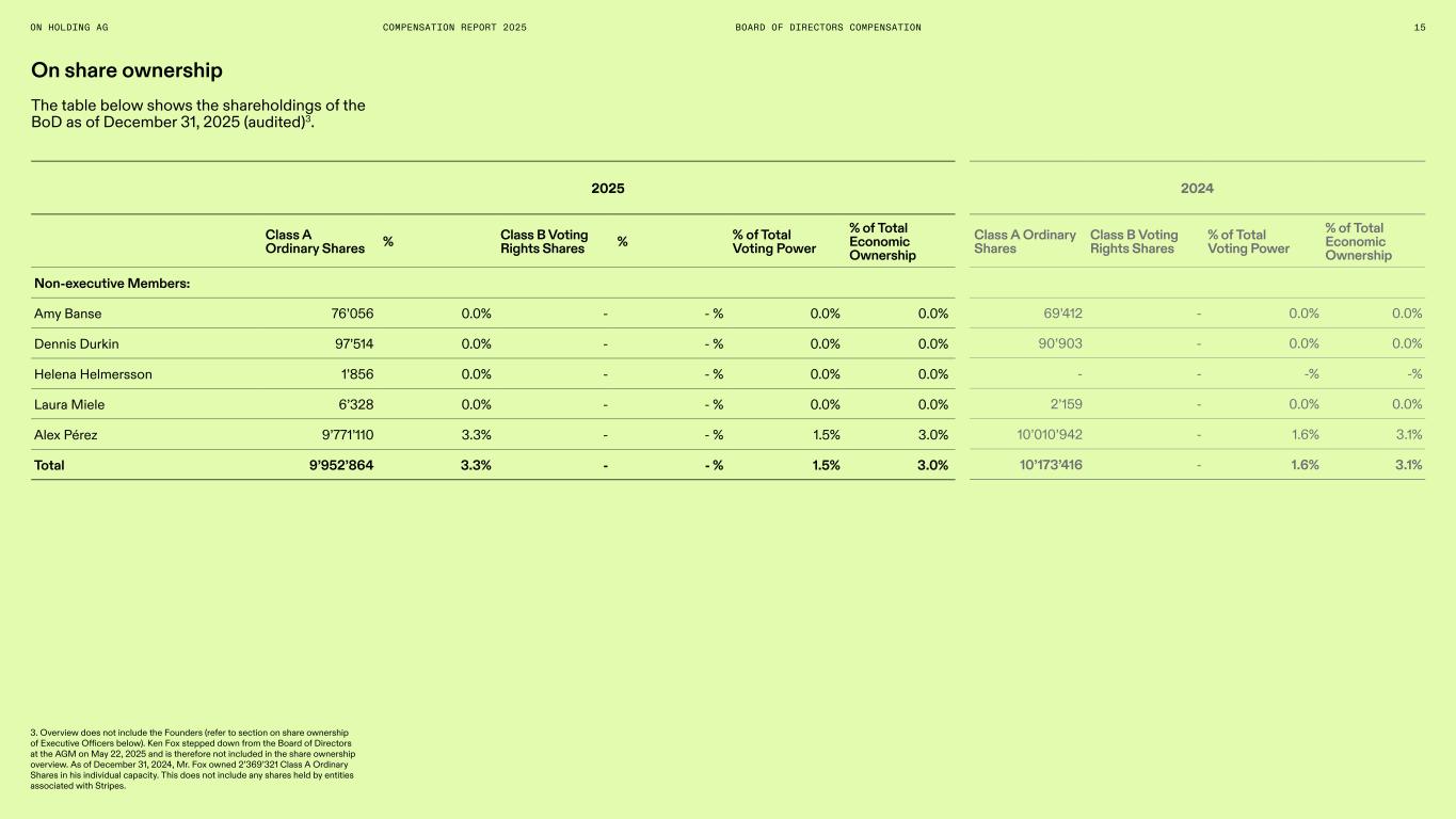 ON HOLDING AG COMPENSATION REPORT 2025 On share ownership The table below shows the shareholdings of the BoD as of December 31, 2025 (audited)3. 2025 Class A Ordinary Shares % Class B Voting Rights Shares % % of Total Voting Power % of Total Economic Ownership Non-executive Members: Amy Banse 76’056 0.0% - - % 0.0% 0.0% Dennis Durkin 97’514 0.0% - - % 0.0% 0.0% Helena Helmersson 1’856 0.0% - - % 0.0% 0.0% Laura Miele 6’328 0.0% - - % 0.0% 0.0% Alex Pérez 9’771’110 3.3% - - % 1.5% 3.0% Total 9’952’864 3.3% - - % 1.5% 3.0% 2024 Class A Ordinary Shares Class B Voting Rights Shares % of Total Voting Power % of Total Economic Ownership 69’412 - 0.0% 0.0% 90’903 - 0.0% 0.0% - - -% -% 2’159 - 0.0% 0.0% 10’010’942 - 1.6% 3.1% 10’173’416 - 1.6% 3.1% 3. Overview does not include the Founders (refer to section on share ownership of Executive Officers below). Ken Fox stepped down from the Board of Directors at the AGM on May 22, 2025 and is therefore not included in the share ownership overview. As of December 31, 2024, Mr. Fox owned 2’369’321 Class A Ordinary Shares in his individual capacity. This does not include any shares held by entities associated with Stripes. 15BOARD OF DIRECTORS COMPENSATION