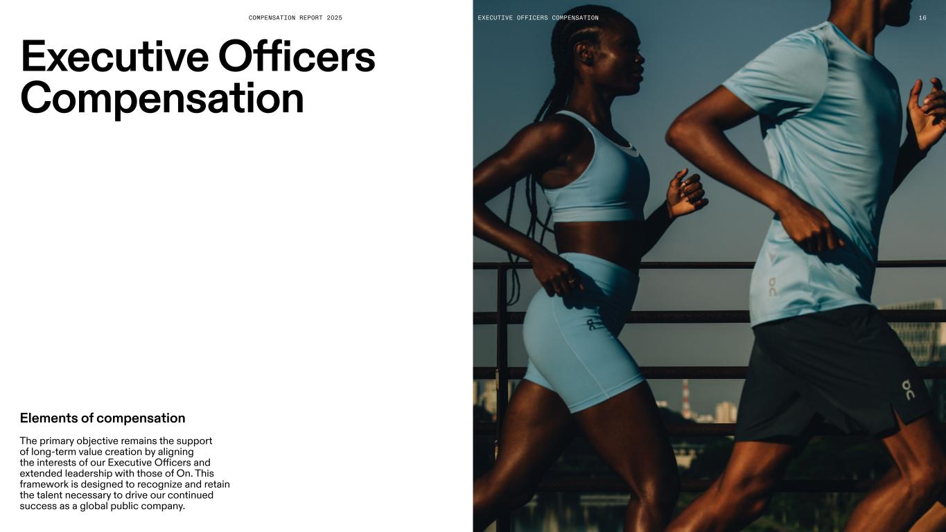 COMPENSATION REPORT 2025 Executive Officers Compensation Elements of compensation The primary objective remains the support of long-term value creation by aligning the interests of our Executive Officers and extended leadership with those of On. This framework is designed to recognize and retain the talent necessary to drive our continued success as a global public company. EXECUTIVE OFFICERS COMPENSATION 16
