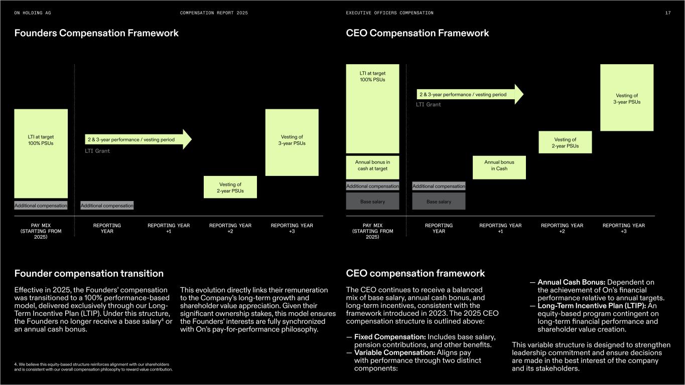 17ON HOLDING AG COMPENSATION REPORT 2025 PAY MIX (STARTING FROM 2025) PAY MIX (STARTING FROM 2025) REPORTING YEAR REPORTING YEAR LTI Grant LTI Grant REPORTING YEAR +1 REPORTING YEAR +1 REPORTING YEAR +2 REPORTING YEAR +2 REPORTING YEAR +3 REPORTING YEAR +3 LTI at target 100% PSUs LTI at target 100% PSUs Vesting of 2-year PSUs Vesting of 2-year PSUs Vesting of 3-year PSUs Vesting of 3-year PSUs 2 & 3-year performance / vesting period 2 & 3-year performance / vesting period Annual bonus in cash at target Annual bonus in Cash Additional compensation Additional compensation Additional compensation Additional compensation Base salary Base salary Founders Compensation Framework CEO Compensation Framework EXECUTIVE OFFICERS COMPENSATION CEO compensation framework The CEO continues to receive a balanced mix of base salary, annual cash bonus, and long-term incentives, consistent with the framework introduced in 2023. The 2025 CEO compensation structure is outlined above: — Fixed Compensation: Includes base salary, pension contributions, and other benefits. — Variable Compensation: Aligns pay with performance through two distinct components: This variable structure is designed to strengthen leadership commitment and ensure decisions are made in the best interest of the company and its stakeholders. — Annual Cash Bonus: Dependent on the achievement of On’s financial performance relative to annual targets. — Long-Term Incentive Plan (LTIP): An equity-based program contingent on long-term financial performance and shareholder value creation. Founder compensation transition Effective in 2025, the Founders’ compensation was transitioned to a 100% performance-based model, delivered exclusively through our Long- Term Incentive Plan (LTIP). Under this structure, the Founders no longer receive a base salary4 or an annual cash bonus. This evolution directly links their remuneration to the Company’s long-term growth and shareholder value appreciation. Given their significant ownership stakes, this model ensures the Founders’ interests are fully synchronized with On’s pay-for-performance philosophy. 4. We believe this equity-based structure reinforces alignment with our shareholders and is consistent with our overall compensation philosophy to reward value contribution.