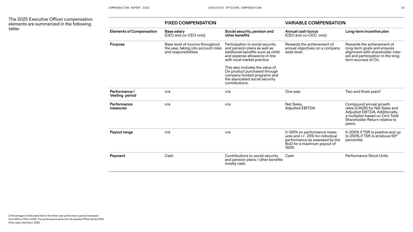 18COMPENSATION REPORT 2025 FIXED COMPENSATION VARIABLE COMPENSATION Elements of Compensation Base salary (CEO and co-CEO only) Social security, pension and other benefits Annual cash bonus (CEO and co-CEO only) Long-term incentive plan Purpose Base level of income throughout the year, taking into account roles and responsibilities Participation in social security and pension plans as well as additional benefits such as child and expense allowance in line with local market practice This also includes the value of On product purchased through company funded programs and the associated social security contributions. Rewards the achievement of annual objectives on a company wide level. Rewards the achievement of long-term goals and ensures alignment with shareholder inter- est and participation in the long- term success of On. Performance / Vesting period n/a n/a One year Two and three years5 Performance measures n/a n/a Net Sales, Adjusted EBITDA Compound annual growth rates (CAGR) for Net Sales and Adjusted EBITDA. Additionally, a multiplier based on On’s Total Shareholder Return relative to peers. Payout range n/a n/a 0-125% on performance meas- ures and +/- 25% for individual performance as assessed by the BoD for a maximum payout of 150% 0-200% if TSR is positive and up to 250% if TSR is at/above 90th percentile. Payment Cash Contributions to social security and pension plans / other benefits mostly cash. Cash Performance Stock Units The 2025 Executive Officer compensation elements are summarized in the following table: 5.Percentage of total award tied to the three-year performance period increased from 50% to 75% in 2025. The performance period for all awarded PSUs will be 100% three-years starting in 2026. EXECUTIVE OFFICERS COMPENSATION