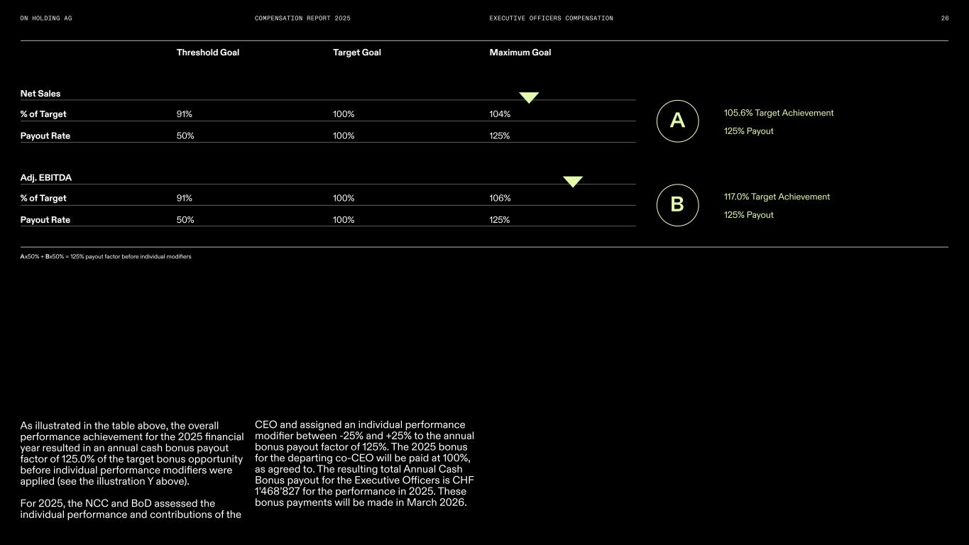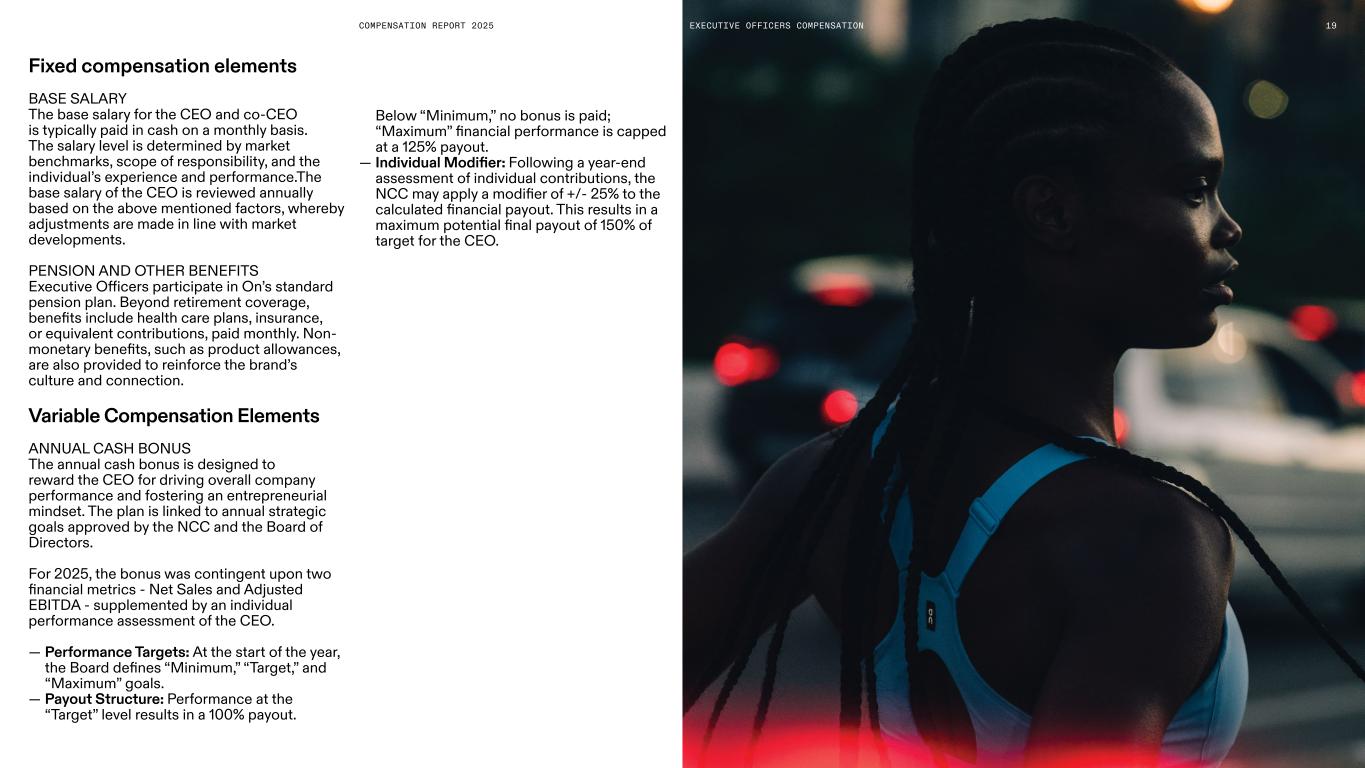 COMPENSATION REPORT 2025 Fixed compensation elements BASE SALARY The base salary for the CEO and co-CEO is typically paid in cash on a monthly basis. The salary level is determined by market benchmarks, scope of responsibility, and the individual’s experience and performance.The base salary of the CEO is reviewed annually based on the above mentioned factors, whereby adjustments are made in line with market developments. PENSION AND OTHER BENEFITS Executive Officers participate in On’s standard pension plan. Beyond retirement coverage, benefits include health care plans, insurance, or equivalent contributions, paid monthly. Non- monetary benefits, such as product allowances, are also provided to reinforce the brand’s culture and connection. Variable Compensation Elements ANNUAL CASH BONUS The annual cash bonus is designed to reward the CEO for driving overall company performance and fostering an entrepreneurial mindset. The plan is linked to annual strategic goals approved by the NCC and the Board of Directors. For 2025, the bonus was contingent upon two financial metrics - Net Sales and Adjusted EBITDA - supplemented by an individual performance assessment of the CEO. — Performance Targets: At the start of the year, the Board defines “Minimum,” “Target,” and “Maximum” goals. — Payout Structure: Performance at the “Target” level results in a 100% payout. Below “Minimum,” no bonus is paid; “Maximum” financial performance is capped at a 125% payout. — Individual Modifier: Following a year-end assessment of individual contributions, the NCC may apply a modifier of +/- 25% to the calculated financial payout. This results in a maximum potential final payout of 150% of target for the CEO. 19EXECUTIVE OFFICERS COMPENSATION