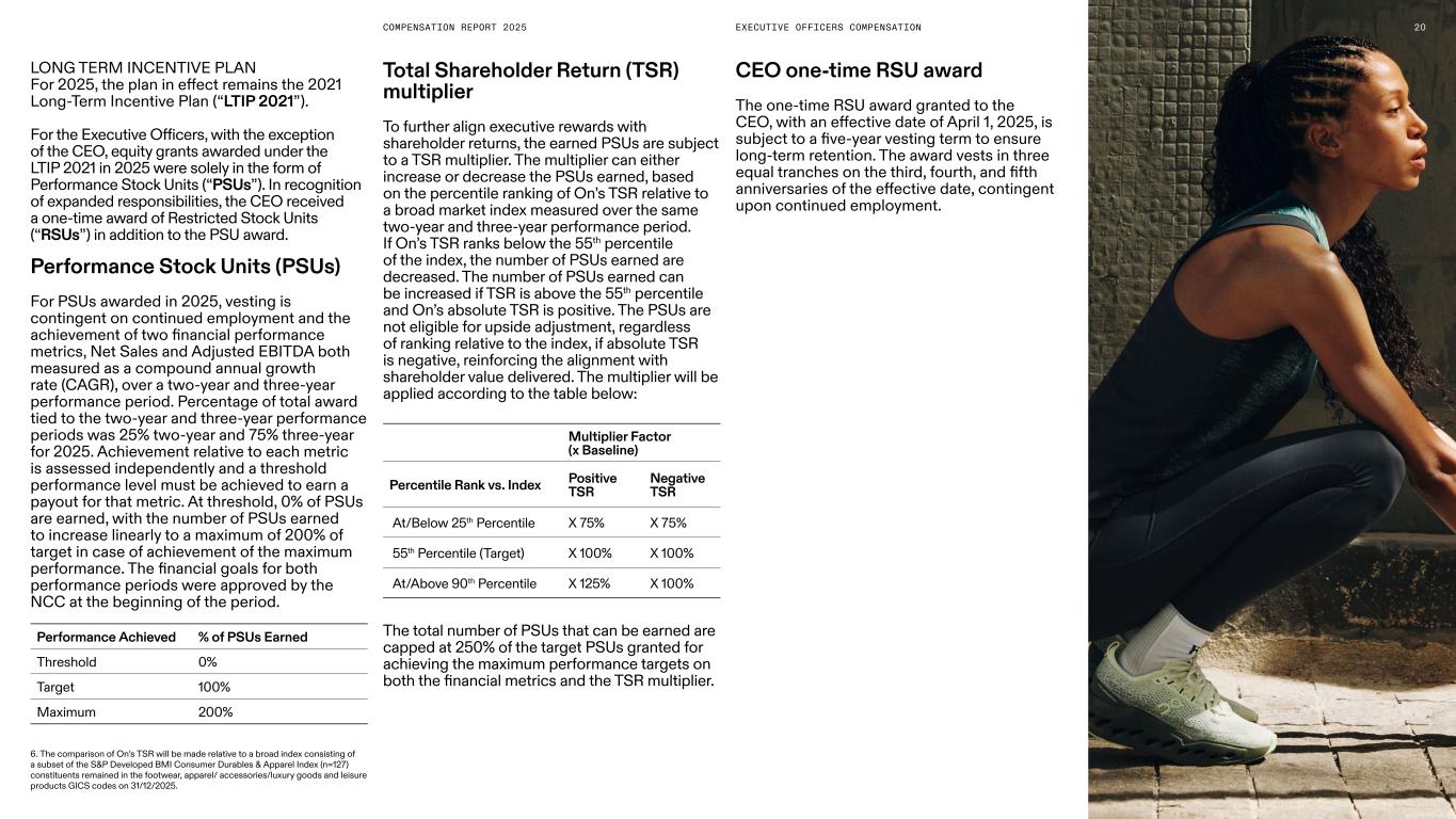 COMPENSATION REPORT 2025 LONG TERM INCENTIVE PLAN For 2025, the plan in effect remains the 2021 Long-Term Incentive Plan (“LTIP 2021”). For the Executive Officers, with the exception of the CEO, equity grants awarded under the LTIP 2021 in 2025 were solely in the form of Performance Stock Units (“PSUs”). In recognition of expanded responsibilities, the CEO received a one-time award of Restricted Stock Units (“RSUs”) in addition to the PSU award. Performance Stock Units (PSUs) For PSUs awarded in 2025, vesting is contingent on continued employment and the achievement of two financial performance metrics, Net Sales and Adjusted EBITDA both measured as a compound annual growth rate (CAGR), over a two-year and three-year performance period. Percentage of total award tied to the two-year and three-year performance periods was 25% two-year and 75% three-year for 2025. Achievement relative to each metric is assessed independently and a threshold performance level must be achieved to earn a payout for that metric. At threshold, 0% of PSUs are earned, with the number of PSUs earned to increase linearly to a maximum of 200% of target in case of achievement of the maximum performance. The financial goals for both performance periods were approved by the NCC at the beginning of the period. Performance Achieved % of PSUs Earned Threshold 0% Target 100% Maximum 200% Multiplier Factor (x Baseline) Percentile Rank vs. Index Positive TSR Negative TSR At/Below 25th Percentile X 75% X 75% 55th Percentile (Target) X 100% X 100% At/Above 90th Percentile X 125% X 100% Total Shareholder Return (TSR) multiplier To further align executive rewards with shareholder returns, the earned PSUs are subject to a TSR multiplier. The multiplier can either increase or decrease the PSUs earned, based on the percentile ranking of On’s TSR relative to a broad market index measured over the same two-year and three-year performance period. If On’s TSR ranks below the 55th percentile of the index, the number of PSUs earned are decreased. The number of PSUs earned can be increased if TSR is above the 55th percentile and On’s absolute TSR is positive. The PSUs are not eligible for upside adjustment, regardless of ranking relative to the index, if absolute TSR is negative, reinforcing the alignment with shareholder value delivered. The multiplier will be applied according to the table below: The total number of PSUs that can be earned are capped at 250% of the target PSUs granted for achieving the maximum performance targets on both the financial metrics and the TSR multiplier. 6. The comparison of On’s TSR will be made relative to a broad index consisting of a subset of the S&P Developed BMI Consumer Durables & Apparel Index (n=127) constituents remained in the footwear, apparel/ accessories/luxury goods and leisure products GICS codes on 31/12/2025. 20EXECUTIVE OFFICERS COMPENSATION CEO one-time RSU award The one-time RSU award granted to the CEO, with an effective date of April 1, 2025, is subject to a five-year vesting term to ensure long-term retention. The award vests in three equal tranches on the third, fourth, and fifth anniversaries of the effective date, contingent upon continued employment.