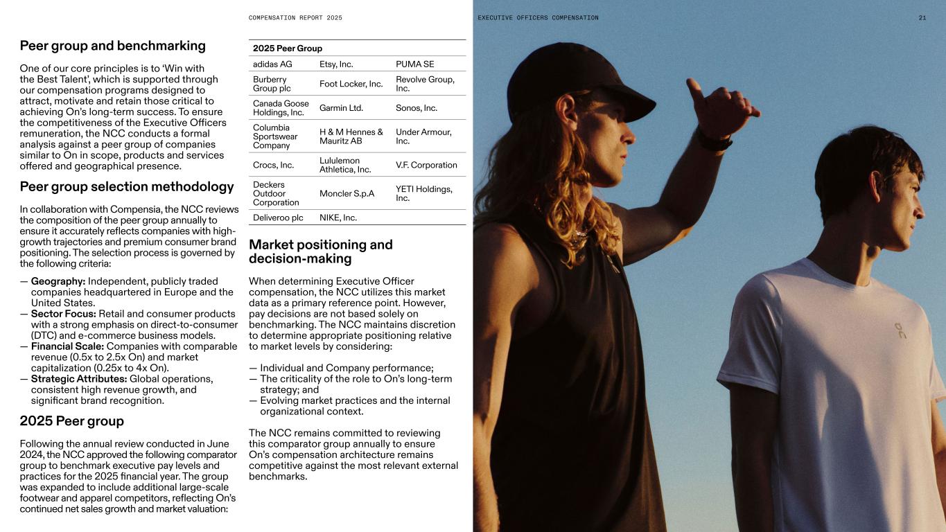 COMPENSATION REPORT 2025 Peer group and benchmarking One of our core principles is to ‘Win with the Best Talent’, which is supported through our compensation programs designed to attract, motivate and retain those critical to achieving On’s long-term success. To ensure the competitiveness of the Executive Officers remuneration, the NCC conducts a formal analysis against a peer group of companies similar to On in scope, products and services offered and geographical presence. Peer group selection methodology In collaboration with Compensia, the NCC reviews the composition of the peer group annually to ensure it accurately reflects companies with high- growth trajectories and premium consumer brand positioning. The selection process is governed by the following criteria: — Geography: Independent, publicly traded companies headquartered in Europe and the United States. — Sector Focus: Retail and consumer products with a strong emphasis on direct-to-consumer (DTC) and e-commerce business models. — Financial Scale: Companies with comparable revenue (0.5x to 2.5x On) and market capitalization (0.25x to 4x On). — Strategic Attributes: Global operations, consistent high revenue growth, and significant brand recognition. 2025 Peer group Following the annual review conducted in June 2024, the NCC approved the following comparator group to benchmark executive pay levels and practices for the 2025 financial year. The group was expanded to include additional large-scale footwear and apparel competitors, reflecting On’s continued net sales growth and market valuation: 2025 Peer Group adidas AG Etsy, Inc. PUMA SE Burberry Group plc Foot Locker, Inc. Revolve Group, Inc. Canada Goose Holdings, Inc. Garmin Ltd. Sonos, Inc. Columbia Sportswear Company H & M Hennes & Mauritz AB Under Armour, Inc. Crocs, Inc. Lululemon Athletica, Inc. V.F. Corporation Deckers Outdoor Corporation Moncler S.p.A YETI Holdings, Inc. Deliveroo plc NIKE, Inc. 21EXECUTIVE OFFICERS COMPENSATION Market positioning and decision-making When determining Executive Officer compensation, the NCC utilizes this market data as a primary reference point. However, pay decisions are not based solely on benchmarking. The NCC maintains discretion to determine appropriate positioning relative to market levels by considering: — Individual and Company performance; — The criticality of the role to On’s long-term strategy; and — Evolving market practices and the internal organizational context. The NCC remains committed to reviewing this comparator group annually to ensure On’s compensation architecture remains competitive against the most relevant external benchmarks.
