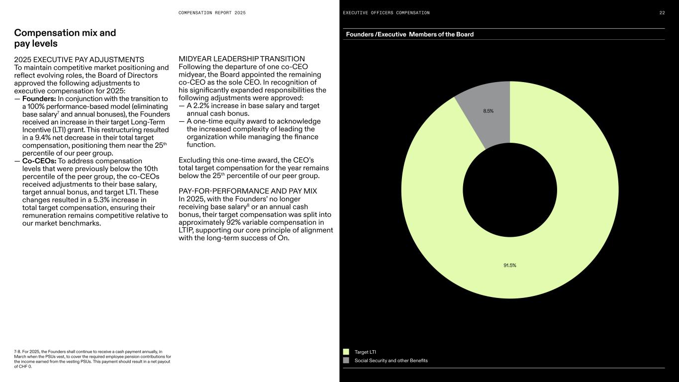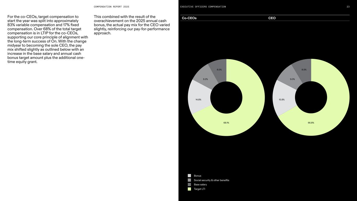 COMPENSATION REPORT 2025 Social Security and other Benefits Target LTI Founders /Executive Members of the BoardCompensation mix and pay levels 2025 EXECUTIVE PAY ADJUSTMENTS To maintain competitive market positioning and reflect evolving roles, the Board of Directors approved the following adjustments to executive compensation for 2025: — Founders: In conjunction with the transition to a 100% performance-based model (eliminating base salary7 and annual bonuses), the Founders received an increase in their target Long-Term Incentive (LTI) grant. This restructuring resulted in a 9.4% net decrease in their total target compensation, positioning them near the 25th percentile of our peer group. — Co-CEOs: To address compensation levels that were previously below the 10th percentile of the peer group, the co-CEOs received adjustments to their base salary, target annual bonus, and target LTI. These changes resulted in a 5.3% increase in total target compensation, ensuring their remuneration remains competitive relative to our market benchmarks. MIDYEAR LEADERSHIP TRANSITION Following the departure of one co-CEO midyear, the Board appointed the remaining co-CEO as the sole CEO. In recognition of his significantly expanded responsibilities the following adjustments were approved: — A 2.2% increase in base salary and target annual cash bonus. — A one-time equity award to acknowledge the increased complexity of leading the organization while managing the finance function. Excluding this one-time award, the CEO’s total target compensation for the year remains below the 25th percentile of our peer group. PAY-FOR-PERFORMANCE AND PAY MIX In 2025, with the Founders’ no longer receiving base salary8 or an annual cash bonus, their target compensation was split into approximately 92% variable compensation in LTIP, supporting our core principle of alignment with the long-term success of On. 22EXECUTIVE OFFICERS COMPENSATION 7-8. For 2025, the Founders shall continue to receive a cash payment annually, in March when the PSUs vest, to cover the required employee pension contributions for the income earned from the vesting PSUs. This payment should result in a net payout of CHF 0. 8.5% 91.5%