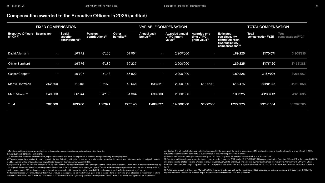 24ON HOLDING AG COMPENSATION REPORT 2025 Compensation awarded to the Executive Officers in 2025 (audited) FIXED COMPENSATION VARIABLE COMPENSATION TOTAL COMPENSATION Executive Officers (in CHF) Base salary Social security contributions(1) Pension contributions(2) Other benefits(3) Annual cash bonus (4) Awarded annual LTIP21 grant value(5) Awarded one- time LTIP21 grant value(6) Estimated social security contributions on awarded equity compensation (7)(8) Total compensation FY25 Total compensation FY24 David Allemann - 16’772 6’120 57’954 - 2’900’000 - 189’225 3’170’071 3’308’816 Olivier Bernhard - 16’776 6’182 59’237 - 2’900’000 - 189’225 3’171’420 3’456’388 Caspar Coppetti - 16’707 5’143 56’922 - 2’900’000 - 189’225 3’167’997 3’265’907 Martin Hoffmann 362’500 67’401 86’978 49’664 838’827 2’900’000 5’000’000 515’475 9’820’845 4’050’958 Marc Maurer (9) 340’000 66’044 84’198 51’364 630’000 2’900’000 - 189’225 4’260’831 4’125’695 Total 702’500 183’700 188’621 275’140 1’468’827 14’500’000 5’000’000 1’272’375 23’591’164 18’207’765 (1) Employer-paid social security contributions on base salary, annual cash bonus, and applicable other benefits. (2) Employer-paid pension contributions. (3) Other benefits comprise child allowance, expense allowance, and value of On product purchased through company funded programs. (4) The payment of the annual cash bonus occurs in the year following which the compensation is allocated to; annual cash bonus amounts include the individual performance modifier applied on top of the calculated payout factor based on financial performance in 2025. (5)Represents gross CHF amounts awarded in PSUs, valued at the applicable fair market value grant price of the annual grant allocation. The number of shares is determined by dividing each Executive Officer’s annual equity entitlement by the applicable fair market value grant price. The fair market value grant price is determined as the average of the closing share prices of 10 trading days prior to the date of grant, subject to an administrative period of 2-3 business days to allow for the processing of grants. (6) Represents gross CHF amounts awarded in RSUs, valued at the applicable fair market value grant price of the one-time promotional grant allocation in recognition of taking the full responsibilities of the CEO role. The number of shares is determined by dividing the additional equity amount of CHF 5’000’000 by the applicable fair market value EXECUTIVE OFFICERS COMPENSATION grant price. The fair market value grant price is determined as the average of the closing share prices of 10 trading days prior to the effective date of grant of April 1, 2025, subject to an administrative period of 2-3 business days to allow for the processing of grants.. (7) Estimated future employer-paid social security contributions on gross CHF amounts awarded in PSUs or RSUs in 2025.. (8) Employer-paid social security contributions on equity-related income in 2025 totaled CHF 5,010,898. This was related to the Executive Officers PSUs that vested in 2025 and the exercising of stock options awarded in previous years (2021, 2022, and 2023). The amounts by individual were as follows: David Allemann CHF 966’646; Olivier Bernhard CHF 1’087’837; Caspar Coppetti CHF 1’903’946; Martin Hoffmann CHF 604’806; Marc Maurer CHF 447’663 (who acted as an Executive Officer until 31 March 2025). (9) Acted as an Executive Officer until March 31, 2025. They remained on payroll for the remainder of 2025 as agreed to, and approximately CHF 2.5 million (86%) of the equity awarded in 2025 will be forfeited as per the pro-ration rules set in the LTIP 2021 plan terms.