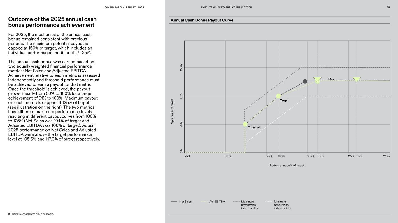COMPENSATION REPORT 2025 Max EXECUTIVE OFFICERS COMPENSATION Annual Cash Bonus Payout Curve Performance as % of target Threshold Target Pa yo ut a s % o f t ar ge t Outcome of the 2025 annual cash bonus performance achievement For 2025, the mechanics of the annual cash bonus remained consistent with previous periods. The maximum potential payout is capped at 150% of target, which includes an individual performance modifier of +/- 25%. The annual cash bonus was earned based on two equally weighted financial performance metrics: Net Sales and Adjusted EBITDA. Achievement relative to each metric is assessed independently and threshold performance must be achieved to earn a payout for that metric. Once the threshold is achieved, the payout grows linearly from 50% to 100% for a target achievement of 91% to 100%. Maximum payout on each metric is capped at 125% of target (see illustration on the right). The two metrics have different maximum performance levels resulting in different payout curves from 100% to 125% (Net Sales was 104% of target and Adjusted EBITDA was 106% of target). Actual 2025 performance on Net Sales and Adjusted EBITDA were above the target performance level at 105.6% and 117.0% of target respectively. 75% 15 0% 10 0% 50 % 0% 95% 100% 106% 117%105% 115% 125%85% Adj. EBITDA Maximum payout with indv. modifier Minimum payout with indv. modifier Net Sales 9. Refers to consolidated group financials. 25