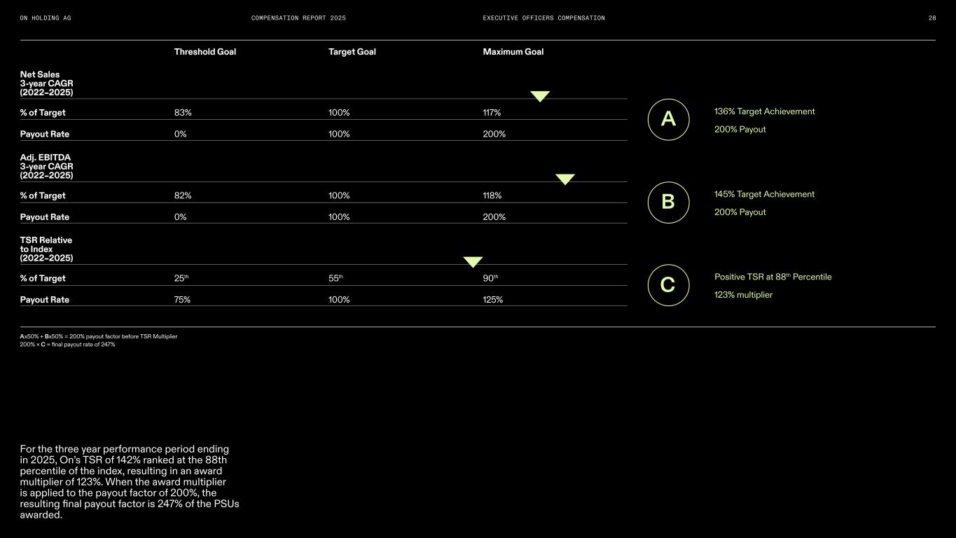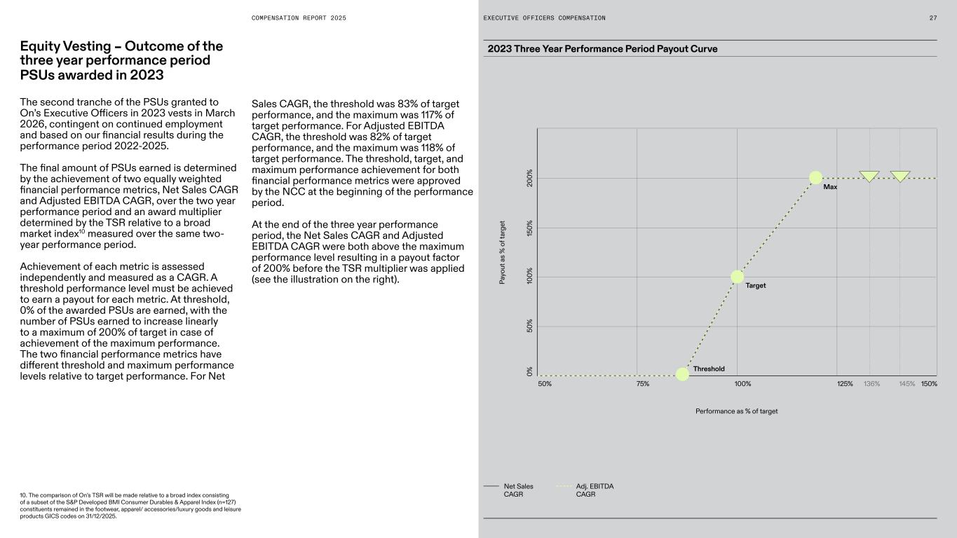 COMPENSATION REPORT 2025 2023 Three Year Performance Period Payout Curve Performance as % of target Pa yo ut a s % o f t ar ge t Threshold Max Target 50% 20 0% 15 0% 10 0% 50 % 0% 100% 136% 145%125% 150%75% Adj. EBITDA CAGR Net Sales CAGR Equity Vesting – Outcome of the three year performance period PSUs awarded in 2023 The second tranche of the PSUs granted to On’s Executive Officers in 2023 vests in March 2026, contingent on continued employment and based on our financial results during the performance period 2022-2025. The final amount of PSUs earned is determined by the achievement of two equally weighted financial performance metrics, Net Sales CAGR and Adjusted EBITDA CAGR, over the two year performance period and an award multiplier determined by the TSR relative to a broad market index10 measured over the same two- year performance period. Achievement of each metric is assessed independently and measured as a CAGR. A threshold performance level must be achieved to earn a payout for each metric. At threshold, 0% of the awarded PSUs are earned, with the number of PSUs earned to increase linearly to a maximum of 200% of target in case of achievement of the maximum performance. The two financial performance metrics have different threshold and maximum performance levels relative to target performance. For Net Sales CAGR, the threshold was 83% of target performance, and the maximum was 117% of target performance. For Adjusted EBITDA CAGR, the threshold was 82% of target performance, and the maximum was 118% of target performance. The threshold, target, and maximum performance achievement for both financial performance metrics were approved by the NCC at the beginning of the performance period. At the end of the three year performance period, the Net Sales CAGR and Adjusted EBITDA CAGR were both above the maximum performance level resulting in a payout factor of 200% before the TSR multiplier was applied (see the illustration on the right). 10. The comparison of On’s TSR will be made relative to a broad index consisting of a subset of the S&P Developed BMI Consumer Durables & Apparel Index (n=127) constituents remained in the footwear, apparel/ accessories/luxury goods and leisure products GICS codes on 31/12/2025. EXECUTIVE OFFICERS COMPENSATION 27