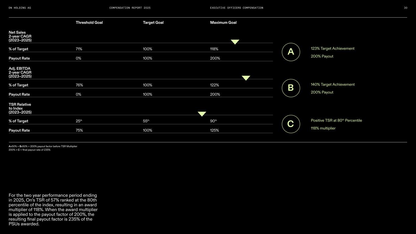 COMPENSATION REPORT 2025 2024 Two Year Performance Period Payout Curve Performance as % of target Pa yo ut a s % o f t ar ge t Threshold Max Target 50% 20 0% 15 0% 10 0% 50 % 0% 100% 140%125% 150%75% Adj. EBITDA CAGR Net Sales CAGR Equity Vesting – Outcome of the two year performance period PSUs awarded in 2024 The first tranche of the PSUs granted to On’s Executive Officers in 2024 vests in March 2026, contingent on continued employment and based on our financial results during the performance period 2023-2025. The final amount of PSUs earned is determined by the achievement of two rigorous and equally weighted financial performance metrics, Net Sales CAGR and Adjusted EBITDA CAGR, over the two year performance period and an award multiplier determined by the TSR relative to a broad market index measured over the same two-year performance period. Achievement of each metric is assessed independently and measured as a CAGR. A threshold performance level must be achieved to earn a payout for each metric. At threshold, 0% of the awarded PSUs are earned, with the number of PSUs earned to increase linearly to a maximum of 200% of target in case of achievement of the maximum performance. The two financial performance metrics have different threshold and maximum performance levels relative to target performance. For Net Sales CAGR, the threshold was 71% of target performance, and the maximum was 118% of target performance. For Adjusted EBITDA CAGR, the threshold was 76% of target performance, and the maximum was 122% of target performance. The threshold, target, and maximum performance achievement for both financial performance metrics were approved by the NCC at the beginning of the performance period. At the end of the two year performance period, the Net Sales CAGR and Adjusted EBITDA CAGR were both above the maximum performance level resulting in a payout factor of 200% before the TSR multiplier was applied (see the illustration on the right). 11. The comparison of On’s TSR will be made relative to a broad index consisting of a subset of the S&P Developed BMI Consumer Durables & Apparel Index (n=127) constituents remained in the footwear, apparel/ accessories/luxury goods and leisure products GICS codes on 31/12/2025. 29EXECUTIVE OFFICERS COMPENSATION