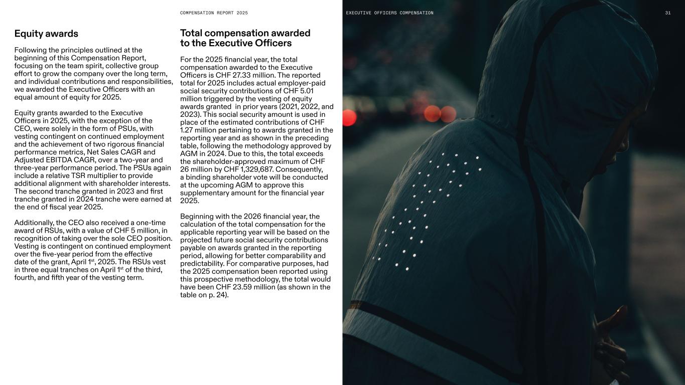 COMPENSATION REPORT 2025 Equity awards Following the principles outlined at the beginning of this Compensation Report, focusing on the team spirit, collective group effort to grow the company over the long term, and individual contributions and responsibilities, we awarded the Executive Officers with an equal amount of equity for 2025. Equity grants awarded to the Executive Officers in 2025, with the exception of the CEO, were solely in the form of PSUs, with vesting contingent on continued employment and the achievement of two rigorous financial performance metrics, Net Sales CAGR and Adjusted EBITDA CAGR, over a two-year and three-year performance period. The PSUs again include a relative TSR multiplier to provide additional alignment with shareholder interests. The second tranche granted in 2023 and first tranche granted in 2024 tranche were earned at the end of fiscal year 2025. Additionally, the CEO also received a one-time award of RSUs, with a value of CHF 5 million, in recognition of taking over the sole CEO position. Vesting is contingent on continued employment over the five-year period from the effective date of the grant, April 1st, 2025. The RSUs vest in three equal tranches on April 1st of the third, fourth, and fifth year of the vesting term. Total compensation awarded to the Executive Officers For the 2025 financial year, the total compensation awarded to the Executive Officers is CHF 27.33 million. The reported total for 2025 includes actual employer-paid social security contributions of CHF 5.01 million triggered by the vesting of equity awards granted in prior years (2021, 2022, and 2023). This social security amount is used in place of the estimated contributions of CHF 1.27 million pertaining to awards granted in the reporting year and as shown in the preceding table, following the methodology approved by AGM in 2024. Due to this, the total exceeds the shareholder-approved maximum of CHF 26 million by CHF 1,329,687. Consequently, a binding shareholder vote will be conducted at the upcoming AGM to approve this supplementary amount for the financial year 2025. Beginning with the 2026 financial year, the calculation of the total compensation for the applicable reporting year will be based on the projected future social security contributions payable on awards granted in the reporting period, allowing for better comparability and predictability. For comparative purposes, had the 2025 compensation been reported using this prospective methodology, the total would have been CHF 23.59 million (as shown in the table on p. 24). 31EXECUTIVE OFFICERS COMPENSATION