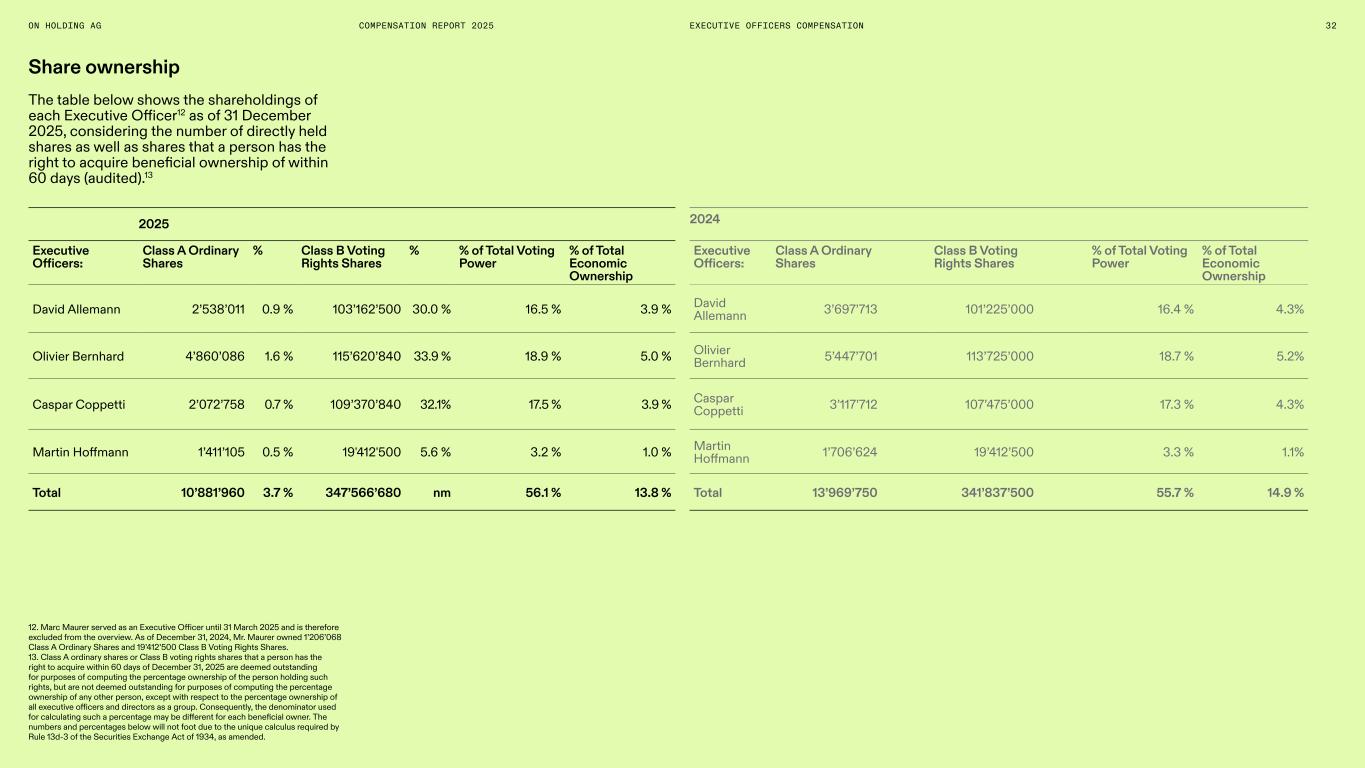 Share ownership The table below shows the shareholdings of each Executive Officer12 as of 31 December 2025, considering the number of directly held shares as well as shares that a person has the right to acquire beneficial ownership of within 60 days (audited).13 12. Marc Maurer served as an Executive Officer until 31 March 2025 and is therefore excluded from the overview. As of December 31, 2024, Mr. Maurer owned 1’206’068 Class A Ordinary Shares and 19’412’500 Class B Voting Rights Shares. 13. Class A ordinary shares or Class B voting rights shares that a person has the right to acquire within 60 days of December 31, 2025 are deemed outstanding for purposes of computing the percentage ownership of the person holding such rights, but are not deemed outstanding for purposes of computing the percentage ownership of any other person, except with respect to the percentage ownership of all executive officers and directors as a group. Consequently, the denominator used for calculating such a percentage may be different for each beneficial owner. The numbers and percentages below will not foot due to the unique calculus required by Rule 13d-3 of the Securities Exchange Act of 1934, as amended. Executive Officers: Class A Ordinary Shares % Class B Voting Rights Shares % % of Total Voting Power % of Total Economic Ownership David Allemann 2’538’011 0.9 % 103’162’500 30.0 % 16.5 % 3.9 % Olivier Bernhard 4’860’086 1.6 % 115’620’840 33.9 % 18.9 % 5.0 % Caspar Coppetti 2’072’758 0.7 % 109’370’840 32.1% 17.5 % 3.9 % Martin Hoffmann 1’411’105 0.5 % 19'412'500 5.6 % 3.2 % 1.0 % Total 10’881’960 3.7 % 347’566’680 nm 56.1 % 13.8 % Executive Officers: Class A Ordinary Shares Class B Voting Rights Shares % of Total Voting Power % of Total Economic Ownership David Allemann 3’697’713 101’225’000 16.4 % 4.3% Olivier Bernhard 5’447’701 113’725’000 18.7 % 5.2% Caspar Coppetti 3’117’712 107’475’000 17.3 % 4.3% Martin Hoffmann 1’706’624 19’412’500 3.3 % 1.1% Total 13’969’750 341’837’500 55.7 % 14.9 % 2025 2024 EXECUTIVE OFFICERS COMPENSATION 32ON HOLDING AG COMPENSATION REPORT 2025