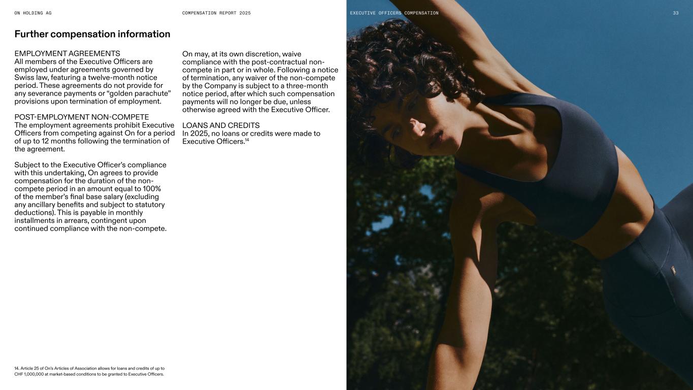 ON HOLDING AG Further compensation information EMPLOYMENT AGREEMENTS All members of the Executive Officers are employed under agreements governed by Swiss law, featuring a twelve-month notice period. These agreements do not provide for any severance payments or “golden parachute” provisions upon termination of employment. POST-EMPLOYMENT NON-COMPETE The employment agreements prohibit Executive Officers from competing against On for a period of up to 12 months following the termination of the agreement. Subject to the Executive Officer’s compliance with this undertaking, On agrees to provide compensation for the duration of the non- compete period in an amount equal to 100% of the member’s final base salary (excluding any ancillary benefits and subject to statutory deductions). This is payable in monthly installments in arrears, contingent upon continued compliance with the non-compete. 14. Article 25 of On’s Articles of Association allows for loans and credits of up to CHF 1,000,000 at market-based conditions to be granted to Executive Officers. 33COMPENSATION REPORT 2025 On may, at its own discretion, waive compliance with the post-contractual non- compete in part or in whole. Following a notice of termination, any waiver of the non-compete by the Company is subject to a three-month notice period, after which such compensation payments will no longer be due, unless otherwise agreed with the Executive Officer. LOANS AND CREDITS In 2025, no loans or credits were made to Executive Officers.14 EXECUTIVE OFFICERS COMPENSATION