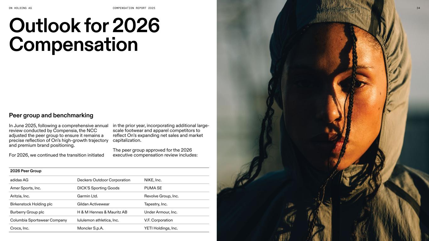 34XXXXXON HOLDING AG COMPENSATION REPORT 2025 Outlook for 2026 Compensation Peer group and benchmarking In June 2025, following a comprehensive annual review conducted by Compensia, the NCC adjusted the peer group to ensure it remains a precise reflection of On’s high-growth trajectory and premium brand positioning. For 2026, we continued the transition initiated 2026 Peer Group adidas AG Deckers Outdoor Corporation NIKE, Inc. Amer Sports, Inc. DICK’S Sporting Goods PUMA SE Aritzia, Inc. Garmin Ltd. Revolve Group, Inc. Birkenstock Holding plc Gildan Activewear Tapestry, Inc. Burberry Group plc H & M Hennes & Mauritz AB Under Armour, Inc. Columbia Sportswear Company lululemon athletica, Inc. V.F. Corporation Crocs, Inc. Moncler S.p.A. YETI Holdings, Inc. in the prior year, incorporating additional large- scale footwear and apparel competitors to reflect On’s expanding net sales and market capitalization. The peer group approved for the 2026 executive compensation review includes: