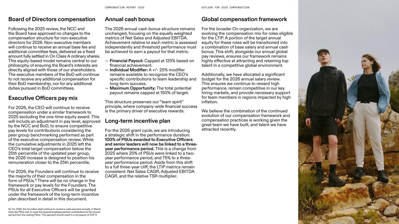 35COMPENSATION REPORT 2025 Board of Directors compensation Following the 2025 review, the NCC and the Board have approved no changes to the compensation structure for non-executive directors for 2026. Non-executive members will continue to receive an annual base fee and additional committee fees, delivered as a fixed amount fully settled in On Class A ordinary shares. This equity-based model remains central to our philosophy of ensuring the Board’s interests are directly aligned with those of our shareholders. The executive members of the BoD will continue to not receive any additional compensation for their BoD membership, nor for any additional duties pursued in BoD committees. Executive Officers pay mix For 2026, the CEO will continue to receive compensation under a similar framework to 2025 excluding the one-time equity award. This will include an adjustment in pay level, approved by the NCC and BoD, to ensure competitive pay levels for contributions considering the peer group benchmarking performed as part of the executive compensation review. While the cumulative adjustments in 2025 left the CEO’s total target compensation below the 25th percentile of the updated peer group, the 2026 increase is designed to position his remuneration closer to the 25th percentile. For 2026, the Founders will continue to receive the majority of their compensation in the form of PSUs.15 There will be no change in the framework or pay levels for the Founders. The PSUs for all Executive Officers will be granted under the framework of the long-term incentive plan described in detail in this document. 15. For 2026, the Founders shall continue to receive a cash payment annually, in March when the PSUs vest, to cover the required employee pension contributions for the income earned from the vesting PSUs. This payment should result in a net payout of CHF 0. OUTLOOK FOR 2026 COMPENSATION Annual cash bonus The 2026 annual cash bonus structure remains unchanged, focusing on the equally weighted metrics of Net Sales and Adjusted EBITDA. Achievement relative to each metric is assessed independently and threshold performance must be achieved to earn a payout for that metric. — Financial Payout: Capped at 125% based on financial achievement. — Individual Modifier: A +/- 25% modifier remains available to recognize the CEO’s specific contributions to team leadership and long-term success. — Maximum Opportunity: The total potential payout remains capped at 150% of target. This structure preserves our “team spirit” principle, where company-wide financial success is the primary driver of executive rewards. Long-term incentive plan For the 2026 grant cycle, we are introducing a strategic shift in the performance duration: 100% of PSUs awarded to Executive Officers and senior leaders will now be linked to a three- year performance period. This is a change from 2025 where 25% of PSUs were linked to a two- year performance period, and 75% to a three- year performance period. Aside from this shift to a full three-year cliff, the LTIP metrics remain consistent: Net Sales CAGR, Adjusted EBITDA CAGR, and the relative TSR multiplier. Global compensation framework For the broader On organization, we are evolving the compensation mix for roles eligible for the LTIP. A portion of the target annual equity for these roles will be transitioned into a combination of base salary and annual cash bonus. This shift, alongside our annual global pay reviews, ensures our framework remains highly effective at attracting and retaining top talent in a competitive global environment. Additionally, we have allocated a significant budget for the 2026 annual salary review. This ensures we continue to reward high performance, remain competitive in our key hiring markets, and provide necessary support for team members in regions impacted by high inflation. We believe the combination of the continued evolution of our compensation framework and compensation practices is working given the great team we have built, and talent we have attracted recently.