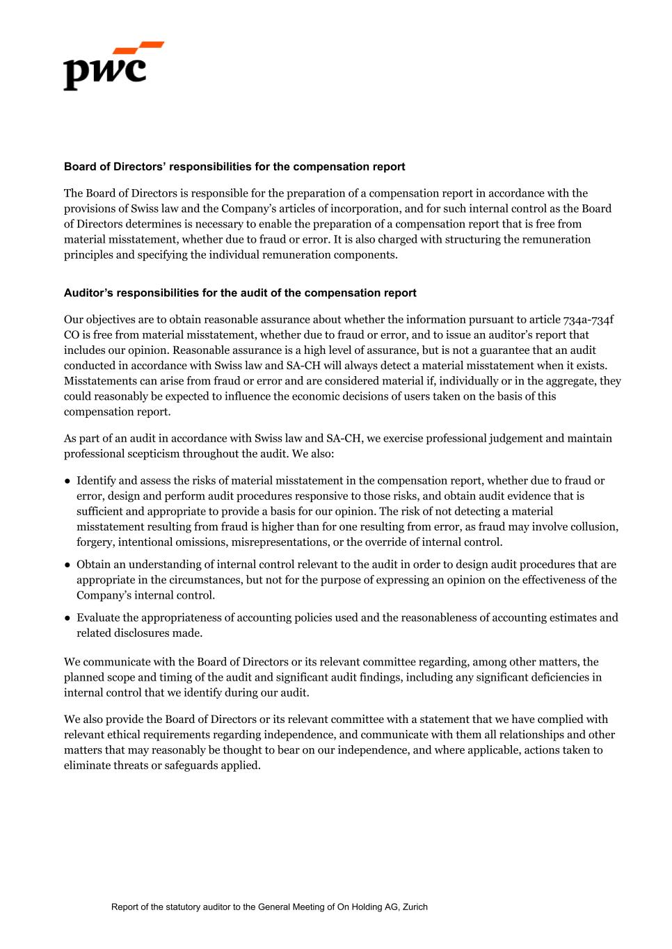 Board of Directors’ responsibilities for the compensation report The Board of Directors is responsible for the preparation of a compensation report in accordance with the provisions of Swiss law and the Company’s articles of incorporation, and for such internal control as the Board of Directors determines is necessary to enable the preparation of a compensation report that is free from material misstatement, whether due to fraud or error. It is also charged with structuring the remuneration principles and specifying the individual remuneration components. Auditor’s responsibilities for the audit of the compensation report Our objectives are to obtain reasonable assurance about whether the information pursuant to article 734a-734f CO is free from material misstatement, whether due to fraud or error, and to issue an auditor’s report that includes our opinion. Reasonable assurance is a high level of assurance, but is not a guarantee that an audit conducted in accordance with Swiss law and SA-CH will always detect a material misstatement when it exists. Misstatements can arise from fraud or error and are considered material if, individually or in the aggregate, they could reasonably be expected to influence the economic decisions of users taken on the basis of this compensation report. As part of an audit in accordance with Swiss law and SA-CH, we exercise professional judgement and maintain professional scepticism throughout the audit. We also: ● Identify and assess the risks of material misstatement in the compensation report, whether due to fraud or error, design and perform audit procedures responsive to those risks, and obtain audit evidence that is sufficient and appropriate to provide a basis for our opinion. The risk of not detecting a material misstatement resulting from fraud is higher than for one resulting from error, as fraud may involve collusion, forgery, intentional omissions, misrepresentations, or the override of internal control. ● Obtain an understanding of internal control relevant to the audit in order to design audit procedures that are appropriate in the circumstances, but not for the purpose of expressing an opinion on the effectiveness of the Company’s internal control. ● Evaluate the appropriateness of accounting policies used and the reasonableness of accounting estimates and related disclosures made. We communicate with the Board of Directors or its relevant committee regarding, among other matters, the planned scope and timing of the audit and significant audit findings, including any significant deficiencies in internal control that we identify during our audit. We also provide the Board of Directors or its relevant committee with a statement that we have complied with relevant ethical requirements regarding independence, and communicate with them all relationships and other matters that may reasonably be thought to bear on our independence, and where applicable, actions taken to eliminate threats or safeguards applied. Report of the statutory auditor to the General Meeting of On Holding AG, Zurich