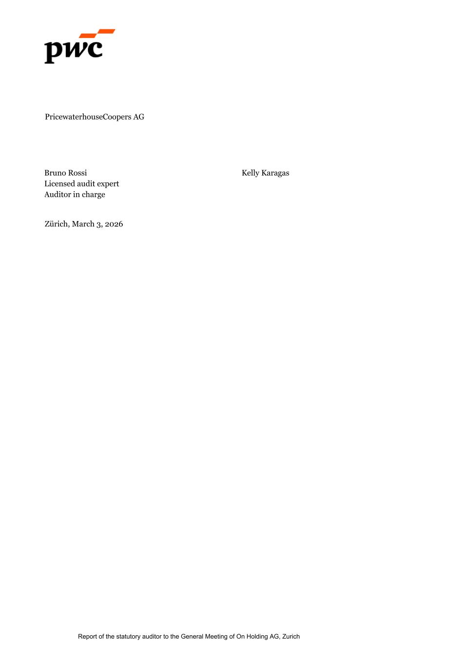 PricewaterhouseCoopers AG Bruno Rossi Kelly Karagas Licensed audit expert Auditor in charge Zürich, March 3, 2026 Report of the statutory auditor to the General Meeting of On Holding AG, Zurich