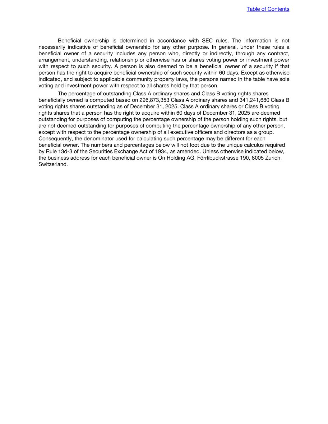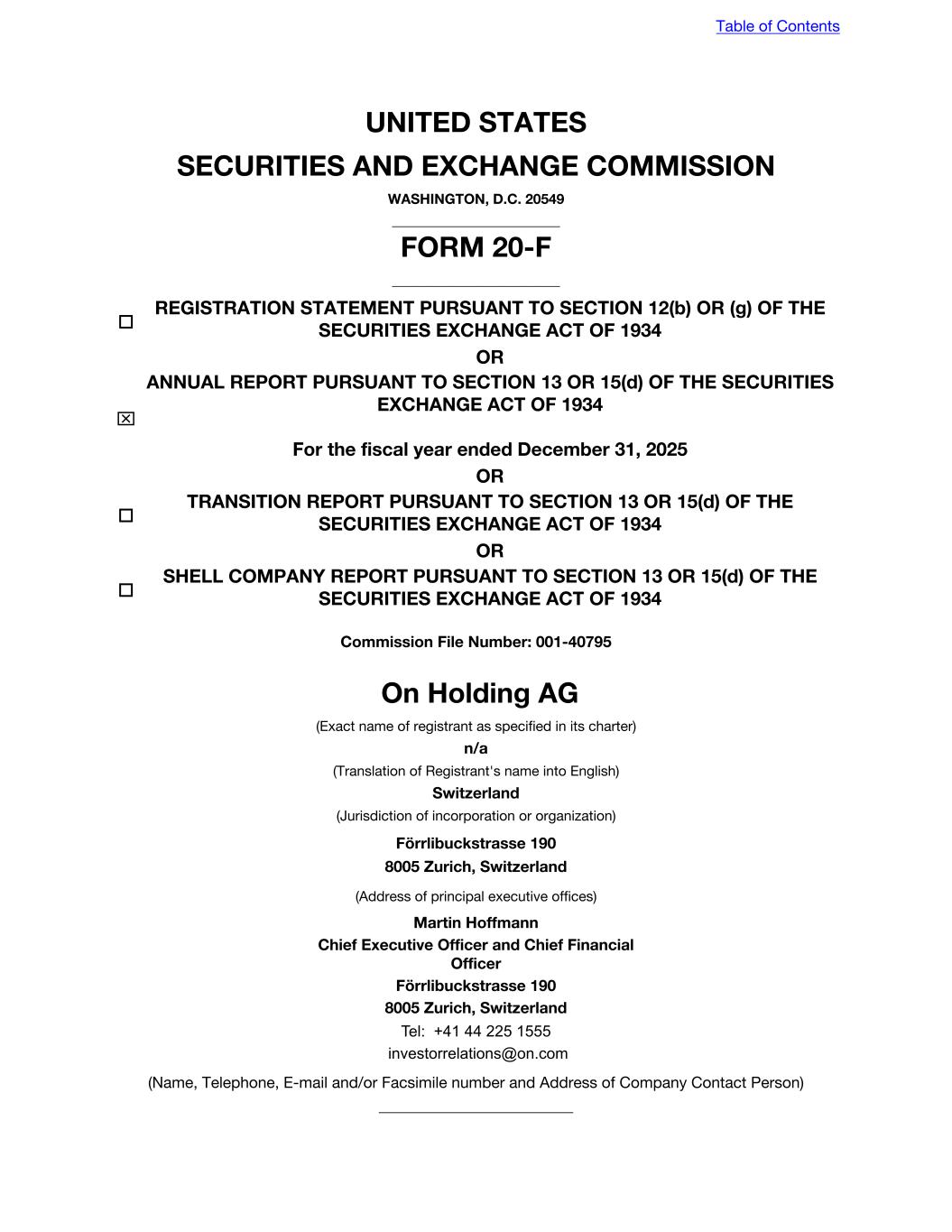 UNITED STATES SECURITIES AND EXCHANGE COMMISSION WASHINGTON, D.C. 20549 ________________________ FORM 20-F ________________________ o REGISTRATION STATEMENT PURSUANT TO SECTION 12(b) OR (g) OF THE SECURITIES EXCHANGE ACT OF 1934 OR x ANNUAL REPORT PURSUANT TO SECTION 13 OR 15(d) OF THE SECURITIES EXCHANGE ACT OF 1934 For the fiscal year ended December 31, 2025 OR o TRANSITION REPORT PURSUANT TO SECTION 13 OR 15(d) OF THE SECURITIES EXCHANGE ACT OF 1934 OR o SHELL COMPANY REPORT PURSUANT TO SECTION 13 OR 15(d) OF THE SECURITIES EXCHANGE ACT OF 1934 Commission File Number: 001-40795 On Holding AG (Exact name of registrant as specified in its charter) n/a (Translation of Registrant's name into English) Switzerland (Jurisdiction of incorporation or organization) Förrlibuckstrasse 190 8005 Zurich, Switzerland (Address of principal executive offices) Martin Hoffmann Chief Executive Officer and Chief Financial Officer Förrlibuckstrasse 190 8005 Zurich, Switzerland Tel: +41 44 225 1555 investorrelations@on.com (Name, Telephone, E-mail and/or Facsimile number and Address of Company Contact Person) _________________________ Table of Contents