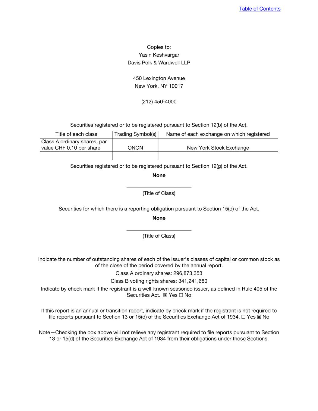 Copies to: Yasin Keshvargar Davis Polk & Wardwell LLP 450 Lexington Avenue New York, NY 10017 (212) 450-4000 Securities registered or to be registered pursuant to Section 12(b) of the Act. Title of each class Trading Symbol(s) Name of each exchange on which registered Class A ordinary shares, par value CHF 0.10 per share ONON New York Stock Exchange Securities registered or to be registered pursuant to Section 12(g) of the Act. None _________________________ (Title of Class) Securities for which there is a reporting obligation pursuant to Section 15(d) of the Act. None _________________________ (Title of Class) Indicate the number of outstanding shares of each of the issuer’s classes of capital or common stock as of the close of the period covered by the annual report. Class A ordinary shares: 296,873,353 Class B voting rights shares: 341,241,680 Indicate by check mark if the registrant is a well-known seasoned issuer, as defined in Rule 405 of the Securities Act. ☒ Yes ☐ No If this report is an annual or transition report, indicate by check mark if the registrant is not required to file reports pursuant to Section 13 or 15(d) of the Securities Exchange Act of 1934. ☐ Yes ☒ No Note—Checking the box above will not relieve any registrant required to file reports pursuant to Section 13 or 15(d) of the Securities Exchange Act of 1934 from their obligations under those Sections. Table of Contents