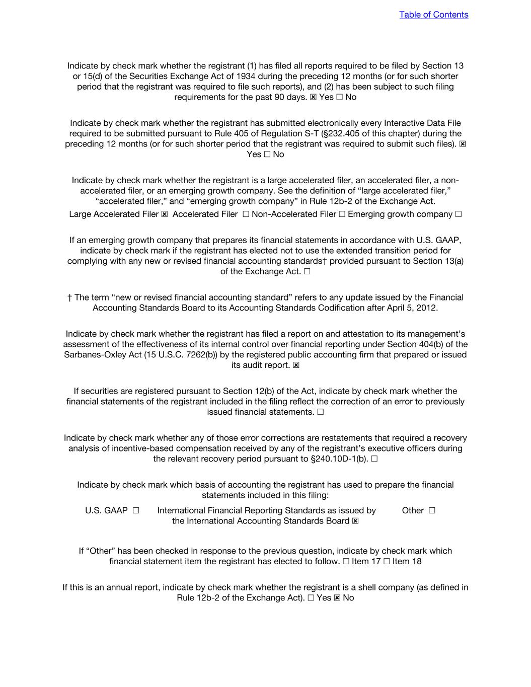 Indicate by check mark whether the registrant (1) has filed all reports required to be filed by Section 13 or 15(d) of the Securities Exchange Act of 1934 during the preceding 12 months (or for such shorter period that the registrant was required to file such reports), and (2) has been subject to such filing requirements for the past 90 days. ☒ Yes ☐ No Indicate by check mark whether the registrant has submitted electronically every Interactive Data File required to be submitted pursuant to Rule 405 of Regulation S-T (§232.405 of this chapter) during the preceding 12 months (or for such shorter period that the registrant was required to submit such files). ☒ Yes ☐ No Indicate by check mark whether the registrant is a large accelerated filer, an accelerated filer, a non- accelerated filer, or an emerging growth company. See the definition of “large accelerated filer,” “accelerated filer,” and “emerging growth company” in Rule 12b-2 of the Exchange Act. Large Accelerated Filer ☒ Accelerated Filer ☐ Non-Accelerated Filer ☐ Emerging growth company ☐ If an emerging growth company that prepares its financial statements in accordance with U.S. GAAP, indicate by check mark if the registrant has elected not to use the extended transition period for complying with any new or revised financial accounting standards† provided pursuant to Section 13(a) of the Exchange Act. ☐ † The term “new or revised financial accounting standard” refers to any update issued by the Financial Accounting Standards Board to its Accounting Standards Codification after April 5, 2012. Indicate by check mark whether the registrant has filed a report on and attestation to its management’s assessment of the effectiveness of its internal control over financial reporting under Section 404(b) of the Sarbanes-Oxley Act (15 U.S.C. 7262(b)) by the registered public accounting firm that prepared or issued its audit report. ☒ If securities are registered pursuant to Section 12(b) of the Act, indicate by check mark whether the financial statements of the registrant included in the filing reflect the correction of an error to previously issued financial statements. ☐ Indicate by check mark whether any of those error corrections are restatements that required a recovery analysis of incentive-based compensation received by any of the registrant’s executive officers during the relevant recovery period pursuant to §240.10D-1(b). ☐ Indicate by check mark which basis of accounting the registrant has used to prepare the financial statements included in this filing: U.S. GAAP ☐ International Financial Reporting Standards as issued by the International Accounting Standards Board ☒ Other ☐ If “Other” has been checked in response to the previous question, indicate by check mark which financial statement item the registrant has elected to follow. ☐ Item 17 ☐ Item 18 If this is an annual report, indicate by check mark whether the registrant is a shell company (as defined in Rule 12b-2 of the Exchange Act). ☐ Yes ☒ No Table of Contents