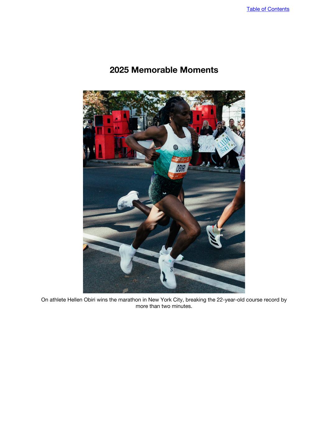 2025 Memorable Moments On athlete Hellen Obiri wins the marathon in New York City, breaking the 22-year-old course record by more than two minutes. Table of Contents