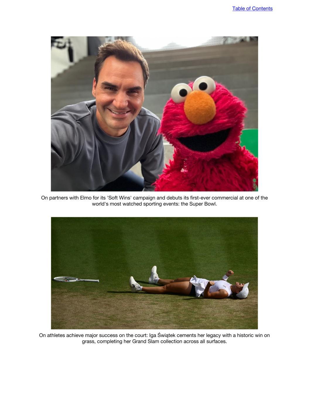 On partners with Elmo for its 'Soft Wins' campaign and debuts its first-ever commercial at one of the world's most watched sporting events: the Super Bowl. On athletes achieve major success on the court: Iga Świątek cements her legacy with a historic win on grass, completing her Grand Slam collection across all surfaces. Table of Contents