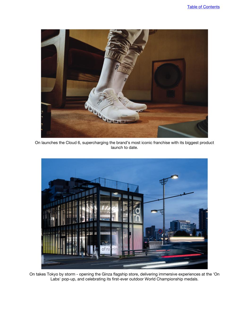 On launches the Cloud 6, supercharging the brand’s most iconic franchise with its biggest product launch to date. On takes Tokyo by storm - opening the Ginza flagship store, delivering immersive experiences at the 'On Labs' pop-up, and celebrating its first-ever outdoor World Championship medals. Table of Contents