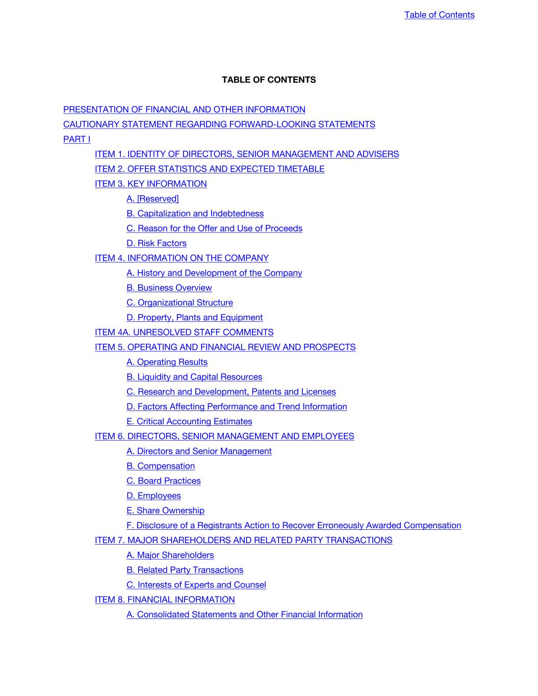 TABLE OF CONTENTS PRESENTATION OF FINANCIAL AND OTHER INFORMATION CAUTIONARY STATEMENT REGARDING FORWARD-LOOKING STATEMENTS PART I ITEM 1. IDENTITY OF DIRECTORS, SENIOR MANAGEMENT AND ADVISERS ITEM 2. OFFER STATISTICS AND EXPECTED TIMETABLE ITEM 3. KEY INFORMATION A. [Reserved] B. Capitalization and Indebtedness C. Reason for the Offer and Use of Proceeds D. Risk Factors ITEM 4. INFORMATION ON THE COMPANY A. History and Development of the Company B. Business Overview C. Organizational Structure D. Property, Plants and Equipment ITEM 4A. UNRESOLVED STAFF COMMENTS ITEM 5. OPERATING AND FINANCIAL REVIEW AND PROSPECTS A. Operating Results B. Liquidity and Capital Resources C. Research and Development, Patents and Licenses D. Factors Affecting Performance and Trend Information E. Critical Accounting Estimates ITEM 6. DIRECTORS, SENIOR MANAGEMENT AND EMPLOYEES A. Directors and Senior Management B. Compensation C. Board Practices D. Employees E. Share Ownership F. Disclosure of a Registrants Action to Recover Erroneously Awarded Compensation ITEM 7. MAJOR SHAREHOLDERS AND RELATED PARTY TRANSACTIONS A. Major Shareholders B. Related Party Transactions C. Interests of Experts and Counsel ITEM 8. FINANCIAL INFORMATION A. Consolidated Statements and Other Financial Information Table of Contents