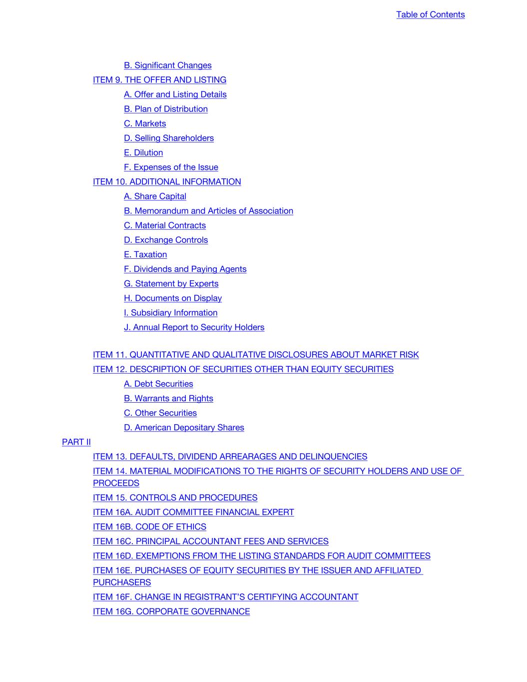 B. Significant Changes ITEM 9. THE OFFER AND LISTING A. Offer and Listing Details B. Plan of Distribution C. Markets D. Selling Shareholders E. Dilution F. Expenses of the Issue ITEM 10. ADDITIONAL INFORMATION A. Share Capital B. Memorandum and Articles of Association C. Material Contracts D. Exchange Controls E. Taxation F. Dividends and Paying Agents G. Statement by Experts H. Documents on Display I. Subsidiary Information J. Annual Report to Security Holders ITEM 11. QUANTITATIVE AND QUALITATIVE DISCLOSURES ABOUT MARKET RISK ITEM 12. DESCRIPTION OF SECURITIES OTHER THAN EQUITY SECURITIES A. Debt Securities B. Warrants and Rights C. Other Securities D. American Depositary Shares PART II ITEM 13. DEFAULTS, DIVIDEND ARREARAGES AND DELINQUENCIES ITEM 14. MATERIAL MODIFICATIONS TO THE RIGHTS OF SECURITY HOLDERS AND USE OF PROCEEDS ITEM 15. CONTROLS AND PROCEDURES ITEM 16A. AUDIT COMMITTEE FINANCIAL EXPERT ITEM 16B. CODE OF ETHICS ITEM 16C. PRINCIPAL ACCOUNTANT FEES AND SERVICES ITEM 16D. EXEMPTIONS FROM THE LISTING STANDARDS FOR AUDIT COMMITTEES ITEM 16E. PURCHASES OF EQUITY SECURITIES BY THE ISSUER AND AFFILIATED PURCHASERS ITEM 16F. CHANGE IN REGISTRANT’S CERTIFYING ACCOUNTANT ITEM 16G. CORPORATE GOVERNANCE Table of Contents