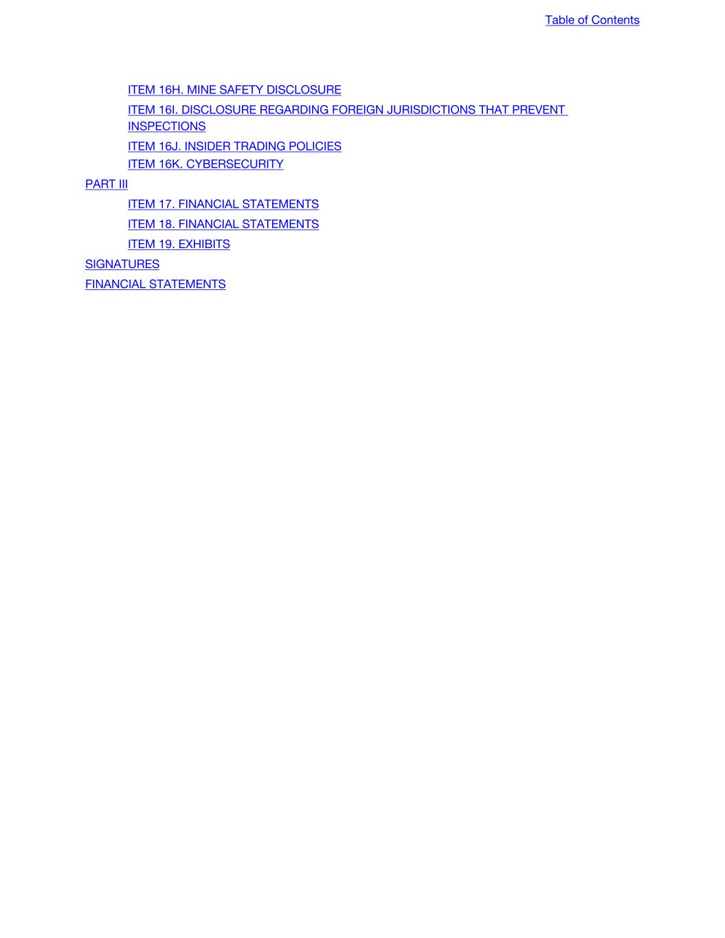ITEM 16H. MINE SAFETY DISCLOSURE ITEM 16I. DISCLOSURE REGARDING FOREIGN JURISDICTIONS THAT PREVENT INSPECTIONS ITEM 16J. INSIDER TRADING POLICIES ITEM 16K. CYBERSECURITY PART III ITEM 17. FINANCIAL STATEMENTS ITEM 18. FINANCIAL STATEMENTS ITEM 19. EXHIBITS SIGNATURES FINANCIAL STATEMENTS Table of Contents