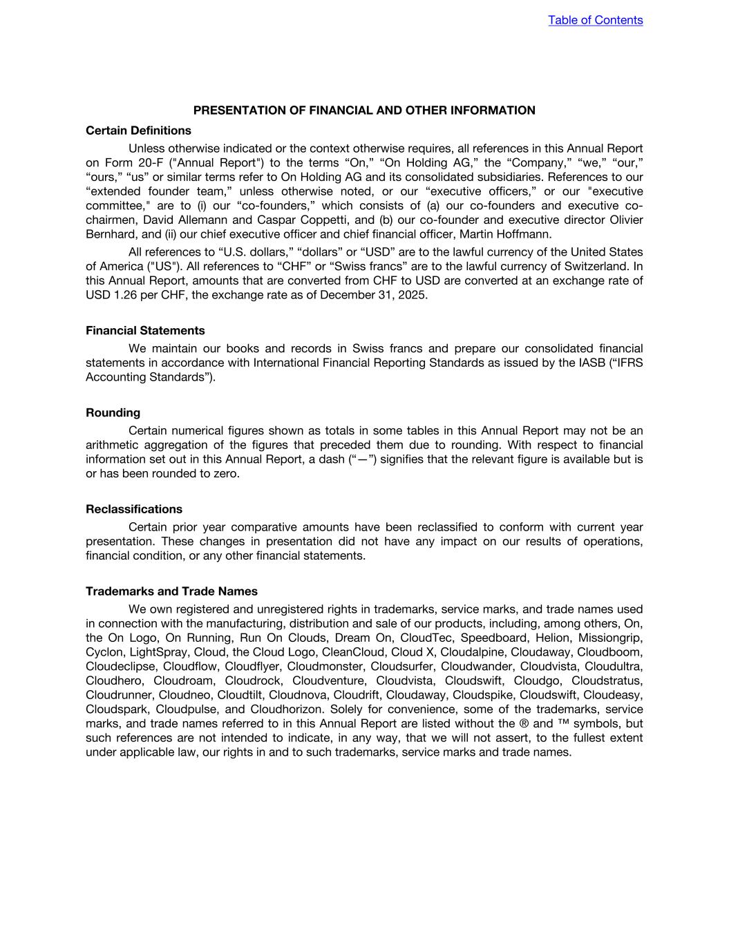 PRESENTATION OF FINANCIAL AND OTHER INFORMATION Certain Definitions Unless otherwise indicated or the context otherwise requires, all references in this Annual Report on Form 20-F ("Annual Report") to the terms “On,” “On Holding AG,” the “Company,” “we,” “our,” “ours,” “us” or similar terms refer to On Holding AG and its consolidated subsidiaries. References to our “extended founder team,” unless otherwise noted, or our “executive officers,” or our "executive committee," are to (i) our “co-founders,” which consists of (a) our co-founders and executive co- chairmen, David Allemann and Caspar Coppetti, and (b) our co-founder and executive director Olivier Bernhard, and (ii) our chief executive officer and chief financial officer, Martin Hoffmann. All references to “U.S. dollars,” “dollars” or “USD” are to the lawful currency of the United States of America ("US"). All references to “CHF” or “Swiss francs” are to the lawful currency of Switzerland. In this Annual Report, amounts that are converted from CHF to USD are converted at an exchange rate of USD 1.26 per CHF, the exchange rate as of December 31, 2025. Financial Statements We maintain our books and records in Swiss francs and prepare our consolidated financial statements in accordance with International Financial Reporting Standards as issued by the IASB (“IFRS Accounting Standards”). Rounding Certain numerical figures shown as totals in some tables in this Annual Report may not be an arithmetic aggregation of the figures that preceded them due to rounding. With respect to financial information set out in this Annual Report, a dash (“—”) signifies that the relevant figure is available but is or has been rounded to zero. Reclassifications Certain prior year comparative amounts have been reclassified to conform with current year presentation. These changes in presentation did not have any impact on our results of operations, financial condition, or any other financial statements. Trademarks and Trade Names We own registered and unregistered rights in trademarks, service marks, and trade names used in connection with the manufacturing, distribution and sale of our products, including, among others, On, the On Logo, On Running, Run On Clouds, Dream On, CloudTec, Speedboard, Helion, Missiongrip, Cyclon, LightSpray, Cloud, the Cloud Logo, CleanCloud, Cloud X, Cloudalpine, Cloudaway, Cloudboom, Cloudeclipse, Cloudflow, Cloudflyer, Cloudmonster, Cloudsurfer, Cloudwander, Cloudvista, Cloudultra, Cloudhero, Cloudroam, Cloudrock, Cloudventure, Cloudvista, Cloudswift, Cloudgo, Cloudstratus, Cloudrunner, Cloudneo, Cloudtilt, Cloudnova, Cloudrift, Cloudaway, Cloudspike, Cloudswift, Cloudeasy, Cloudspark, Cloudpulse, and Cloudhorizon. Solely for convenience, some of the trademarks, service marks, and trade names referred to in this Annual Report are listed without the ® and ™ symbols, but such references are not intended to indicate, in any way, that we will not assert, to the fullest extent under applicable law, our rights in and to such trademarks, service marks and trade names. Table of Contents