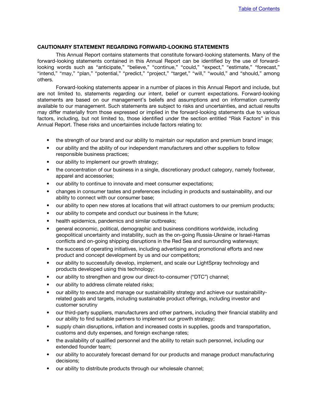 CAUTIONARY STATEMENT REGARDING FORWARD-LOOKING STATEMENTS This Annual Report contains statements that constitute forward-looking statements. Many of the forward-looking statements contained in this Annual Report can be identified by the use of forward- looking words such as “anticipate,” “believe,” “continue,” “could,” “expect,” “estimate,” “forecast,” “intend,” “may,” “plan,” “potential,” “predict,” “project,” “target,” “will,” “would,” and “should,” among others. Forward-looking statements appear in a number of places in this Annual Report and include, but are not limited to, statements regarding our intent, belief or current expectations. Forward-looking statements are based on our management’s beliefs and assumptions and on information currently available to our management. Such statements are subject to risks and uncertainties, and actual results may differ materially from those expressed or implied in the forward-looking statements due to various factors, including, but not limited to, those identified under the section entitled “Risk Factors” in this Annual Report. These risks and uncertainties include factors relating to: • the strength of our brand and our ability to maintain our reputation and premium brand image; • our ability and the ability of our independent manufacturers and other suppliers to follow responsible business practices; • our ability to implement our growth strategy; • the concentration of our business in a single, discretionary product category, namely footwear, apparel and accessories; • our ability to continue to innovate and meet consumer expectations; • changes in consumer tastes and preferences including in products and sustainability, and our ability to connect with our consumer base; • our ability to open new stores at locations that will attract customers to our premium products; • our ability to compete and conduct our business in the future; • health epidemics, pandemics and similar outbreaks; • general economic, political, demographic and business conditions worldwide, including geopolitical uncertainty and instability, such as the on-going Russia-Ukraine or Israel-Hamas conflicts and on-going shipping disruptions in the Red Sea and surrounding waterways; • the success of operating initiatives, including advertising and promotional efforts and new product and concept development by us and our competitors; • our ability to successfully develop, implement, and scale our LightSpray technology and products developed using this technology; • our ability to strengthen and grow our direct-to-consumer (“DTC”) channel; • our ability to address climate related risks; • our ability to execute and manage our sustainability strategy and achieve our sustainability- related goals and targets, including sustainable product offerings, including investor and customer scrutiny • our third-party suppliers, manufacturers and other partners, including their financial stability and our ability to find suitable partners to implement our growth strategy; • supply chain disruptions, inflation and increased costs in supplies, goods and transportation, customs and duty expenses, and foreign exchange rates; • the availability of qualified personnel and the ability to retain such personnel, including our extended founder team; • our ability to accurately forecast demand for our products and manage product manufacturing decisions; • our ability to distribute products through our wholesale channel; Table of Contents
