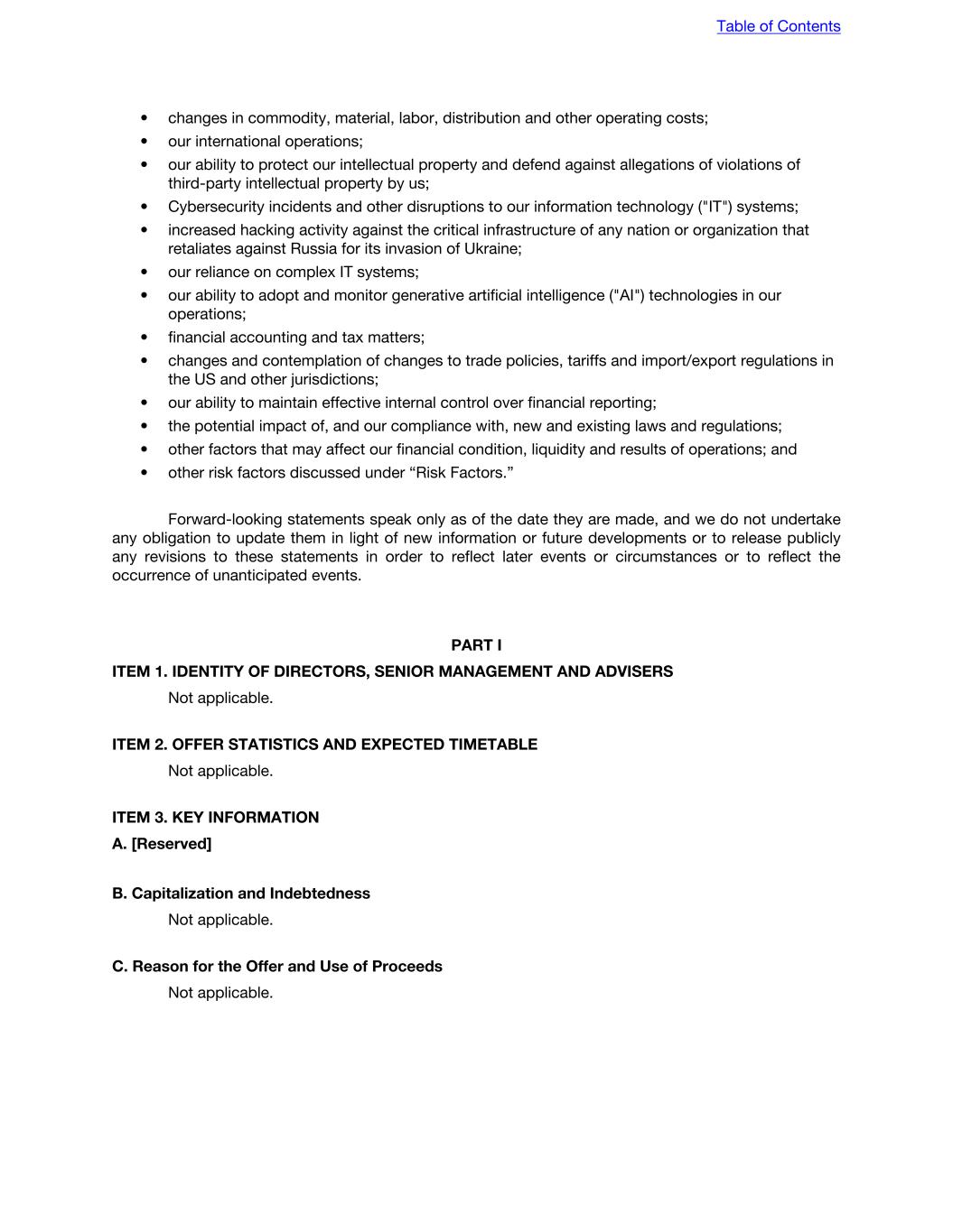 • changes in commodity, material, labor, distribution and other operating costs; • our international operations; • our ability to protect our intellectual property and defend against allegations of violations of third-party intellectual property by us; • Cybersecurity incidents and other disruptions to our information technology ("IT") systems; • increased hacking activity against the critical infrastructure of any nation or organization that retaliates against Russia for its invasion of Ukraine; • our reliance on complex IT systems; • our ability to adopt and monitor generative artificial intelligence ("AI") technologies in our operations; • financial accounting and tax matters; • changes and contemplation of changes to trade policies, tariffs and import/export regulations in the US and other jurisdictions; • our ability to maintain effective internal control over financial reporting; • the potential impact of, and our compliance with, new and existing laws and regulations; • other factors that may affect our financial condition, liquidity and results of operations; and • other risk factors discussed under “Risk Factors.” Forward-looking statements speak only as of the date they are made, and we do not undertake any obligation to update them in light of new information or future developments or to release publicly any revisions to these statements in order to reflect later events or circumstances or to reflect the occurrence of unanticipated events. PART I ITEM 1. IDENTITY OF DIRECTORS, SENIOR MANAGEMENT AND ADVISERS Not applicable. ITEM 2. OFFER STATISTICS AND EXPECTED TIMETABLE Not applicable. ITEM 3. KEY INFORMATION A. [Reserved] B. Capitalization and Indebtedness Not applicable. C. Reason for the Offer and Use of Proceeds Not applicable. Table of Contents