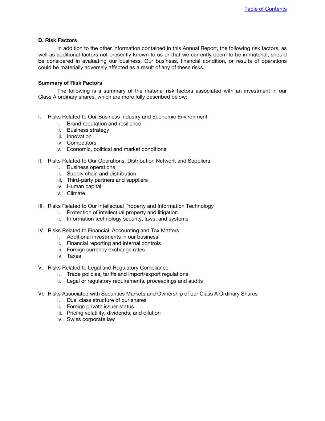 D. Risk Factors In addition to the other information contained in this Annual Report, the following risk factors, as well as additional factors not presently known to us or that we currently deem to be immaterial, should be considered in evaluating our business. Our business, financial condition, or results of operations could be materially adversely affected as a result of any of these risks. Summary of Risk Factors The following is a summary of the material risk factors associated with an investment in our Class A ordinary shares, which are more fully described below: I. Risks Related to Our Business Industry and Economic Environment i. Brand reputation and resilience ii. Business strategy iii. Innovation iv. Competitors v. Economic, political and market conditions II. Risks Related to Our Operations, Distribution Network and Suppliers i. Business operations ii. Supply chain and distribution iii. Third-party partners and suppliers iv. Human capital v. Climate III. Risks Related to Our Intellectual Property and Information Technology i. Protection of intellectual property and litigation ii. Information technology security, laws, and systems IV. Risks Related to Financial, Accounting and Tax Matters i. Additional investments in our business ii. Financial reporting and internal controls iii. Foreign currency exchange rates iv. Taxes V. Risks Related to Legal and Regulatory Compliance i. Trade policies, tariffs and import/export regulations ii. Legal or regulatory requirements, proceedings and audits VI. Risks Associated with Securities Markets and Ownership of our Class A Ordinary Shares i. Dual class structure of our shares ii. Foreign private issuer status iii. Pricing volatility, dividends, and dilution iv. Swiss corporate law Table of Contents