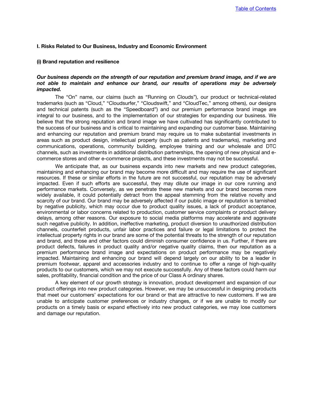 I. Risks Related to Our Business, Industry and Economic Environment (i) Brand reputation and resilience Our business depends on the strength of our reputation and premium brand image, and if we are not able to maintain and enhance our brand, our results of operations may be adversely impacted. The “On” name, our claims (such as “Running on Clouds”), our product or technical-related trademarks (such as “Cloud,” “Cloudsurfer,” “Cloudswift,” and “CloudTec,” among others), our designs and technical patents (such as the “Speedboard”) and our premium performance brand image are integral to our business, and to the implementation of our strategies for expanding our business. We believe that the strong reputation and brand image we have cultivated has significantly contributed to the success of our business and is critical to maintaining and expanding our customer base. Maintaining and enhancing our reputation and premium brand may require us to make substantial investments in areas such as product design, intellectual property (such as patents and trademarks), marketing and communications, operations, community building, employee training and our wholesale and DTC channels, such as investments in additional distribution partnerships, the opening of new physical and e- commerce stores and other e-commerce projects, and these investments may not be successful. We anticipate that, as our business expands into new markets and new product categories, maintaining and enhancing our brand may become more difficult and may require the use of significant resources. If these or similar efforts in the future are not successful, our reputation may be adversely impacted. Even if such efforts are successful, they may dilute our image in our core running and performance markets. Conversely, as we penetrate these new markets and our brand becomes more widely available, it could potentially detract from the appeal stemming from the relative novelty and scarcity of our brand. Our brand may be adversely affected if our public image or reputation is tarnished by negative publicity, which may occur due to product quality issues, a lack of product acceptance, environmental or labor concerns related to production, customer service complaints or product delivery delays, among other reasons. Our exposure to social media platforms may accelerate and aggravate such negative publicity. In addition, ineffective marketing, product diversion to unauthorized distribution channels, counterfeit products, unfair labor practices and failure or legal limitations to protect the intellectual property rights in our brand are some of the potential threats to the strength of our reputation and brand, and those and other factors could diminish consumer confidence in us. Further, if there are product defects, failures in product quality and/or negative quality claims, then our reputation as a premium performance brand image and expectations on product performance may be negatively impacted. Maintaining and enhancing our brand will depend largely on our ability to be a leader in premium footwear, apparel and accessories industry and to continue to offer a range of high-quality products to our customers, which we may not execute successfully. Any of these factors could harm our sales, profitability, financial condition and the price of our Class A ordinary shares. A key element of our growth strategy is innovation, product development and expansion of our product offerings into new product categories. However, we may be unsuccessful in designing products that meet our customers’ expectations for our brand or that are attractive to new customers. If we are unable to anticipate customer preferences or industry changes, or if we are unable to modify our products on a timely basis or expand effectively into new product categories, we may lose customers and damage our reputation. Table of Contents
