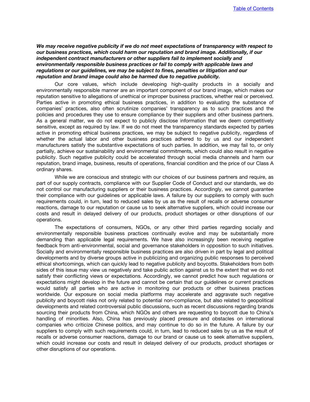 We may receive negative publicity if we do not meet expectations of transparency with respect to our business practices, which could harm our reputation and brand image. Additionally, if our independent contract manufacturers or other suppliers fail to implement socially and environmentally responsible business practices or fail to comply with applicable laws and regulations or our guidelines, we may be subject to fines, penalties or litigation and our reputation and brand image could also be harmed due to negative publicity. Our core values, which include developing high-quality products in a socially and environmentally responsible manner are an important component of our brand image, which makes our reputation sensitive to allegations of unethical or improper business practices, whether real or perceived. Parties active in promoting ethical business practices, in addition to evaluating the substance of companies’ practices, also often scrutinize companies’ transparency as to such practices and the policies and procedures they use to ensure compliance by their suppliers and other business partners. As a general matter, we do not expect to publicly disclose information that we deem competitively sensitive, except as required by law. If we do not meet the transparency standards expected by parties active in promoting ethical business practices, we may be subject to negative publicity, regardless of whether the actual labor and other business practices adhered to by us and our independent manufacturers satisfy the substantive expectations of such parties. In addition, we may fail to, or only partially, achieve our sustainability and environmental commitments, which could also result in negative publicity. Such negative publicity could be accelerated through social media channels and harm our reputation, brand image, business, results of operations, financial condition and the price of our Class A ordinary shares. While we are conscious and strategic with our choices of our business partners and require, as part of our supply contracts, compliance with our Supplier Code of Conduct and our standards, we do not control our manufacturing suppliers or their business practices. Accordingly, we cannot guarantee their compliance with our guidelines or applicable laws. A failure by our suppliers to comply with such requirements could, in turn, lead to reduced sales by us as the result of recalls or adverse consumer reactions, damage to our reputation or cause us to seek alternative suppliers, which could increase our costs and result in delayed delivery of our products, product shortages or other disruptions of our operations. The expectations of consumers, NGOs, or any other third parties regarding socially and environmentally responsible business practices continually evolve and may be substantially more demanding than applicable legal requirements. We have also increasingly been receiving negative feedback from anti-environmental, social and governance stakeholders in opposition to such initiatives. Socially and environmentally responsible business practices are also driven in part by legal and political developments and by diverse groups active in publicizing and organizing public responses to perceived ethical shortcomings, which can quickly lead to negative publicity and boycotts. Stakeholders from both sides of this issue may view us negatively and take public action against us to the extent that we do not satisfy their conflicting views or expectations. Accordingly, we cannot predict how such regulations or expectations might develop in the future and cannot be certain that our guidelines or current practices would satisfy all parties who are active in monitoring our products or other business practices worldwide. Our exposure on social media platforms may accelerate and aggravate such negative publicity and boycott risks not only related to potential non-compliance, but also related to geopolitical developments and related controversial public discussions, such as recent discussions regarding brands sourcing their products from China, which NGOs and others are requesting to boycott due to China’s handling of minorities. Also, China has previously placed pressure and obstacles on international companies who criticize Chinese politics, and may continue to do so in the future. A failure by our suppliers to comply with such requirements could, in turn, lead to reduced sales by us as the result of recalls or adverse consumer reactions, damage to our brand or cause us to seek alternative suppliers, which could increase our costs and result in delayed delivery of our products, product shortages or other disruptions of our operations. Table of Contents