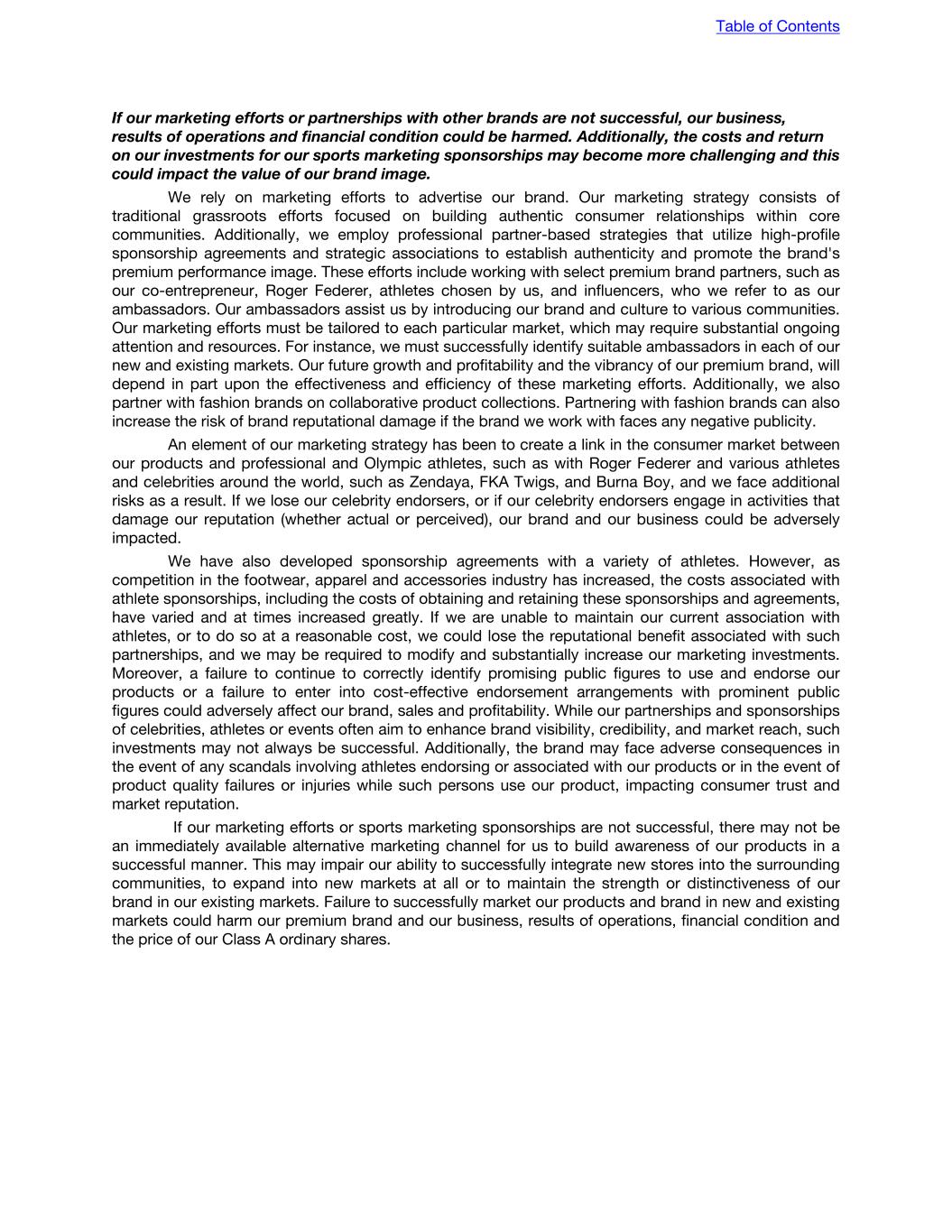 If our marketing efforts or partnerships with other brands are not successful, our business, results of operations and financial condition could be harmed. Additionally, the costs and return on our investments for our sports marketing sponsorships may become more challenging and this could impact the value of our brand image. We rely on marketing efforts to advertise our brand. Our marketing strategy consists of traditional grassroots efforts focused on building authentic consumer relationships within core communities. Additionally, we employ professional partner-based strategies that utilize high-profile sponsorship agreements and strategic associations to establish authenticity and promote the brand's premium performance image. These efforts include working with select premium brand partners, such as our co-entrepreneur, Roger Federer, athletes chosen by us, and influencers, who we refer to as our ambassadors. Our ambassadors assist us by introducing our brand and culture to various communities. Our marketing efforts must be tailored to each particular market, which may require substantial ongoing attention and resources. For instance, we must successfully identify suitable ambassadors in each of our new and existing markets. Our future growth and profitability and the vibrancy of our premium brand, will depend in part upon the effectiveness and efficiency of these marketing efforts. Additionally, we also partner with fashion brands on collaborative product collections. Partnering with fashion brands can also increase the risk of brand reputational damage if the brand we work with faces any negative publicity. An element of our marketing strategy has been to create a link in the consumer market between our products and professional and Olympic athletes, such as with Roger Federer and various athletes and celebrities around the world, such as Zendaya, FKA Twigs, and Burna Boy, and we face additional risks as a result. If we lose our celebrity endorsers, or if our celebrity endorsers engage in activities that damage our reputation (whether actual or perceived), our brand and our business could be adversely impacted. We have also developed sponsorship agreements with a variety of athletes. However, as competition in the footwear, apparel and accessories industry has increased, the costs associated with athlete sponsorships, including the costs of obtaining and retaining these sponsorships and agreements, have varied and at times increased greatly. If we are unable to maintain our current association with athletes, or to do so at a reasonable cost, we could lose the reputational benefit associated with such partnerships, and we may be required to modify and substantially increase our marketing investments. Moreover, a failure to continue to correctly identify promising public figures to use and endorse our products or a failure to enter into cost-effective endorsement arrangements with prominent public figures could adversely affect our brand, sales and profitability. While our partnerships and sponsorships of celebrities, athletes or events often aim to enhance brand visibility, credibility, and market reach, such investments may not always be successful. Additionally, the brand may face adverse consequences in the event of any scandals involving athletes endorsing or associated with our products or in the event of product quality failures or injuries while such persons use our product, impacting consumer trust and market reputation. If our marketing efforts or sports marketing sponsorships are not successful, there may not be an immediately available alternative marketing channel for us to build awareness of our products in a successful manner. This may impair our ability to successfully integrate new stores into the surrounding communities, to expand into new markets at all or to maintain the strength or distinctiveness of our brand in our existing markets. Failure to successfully market our products and brand in new and existing markets could harm our premium brand and our business, results of operations, financial condition and the price of our Class A ordinary shares. Table of Contents