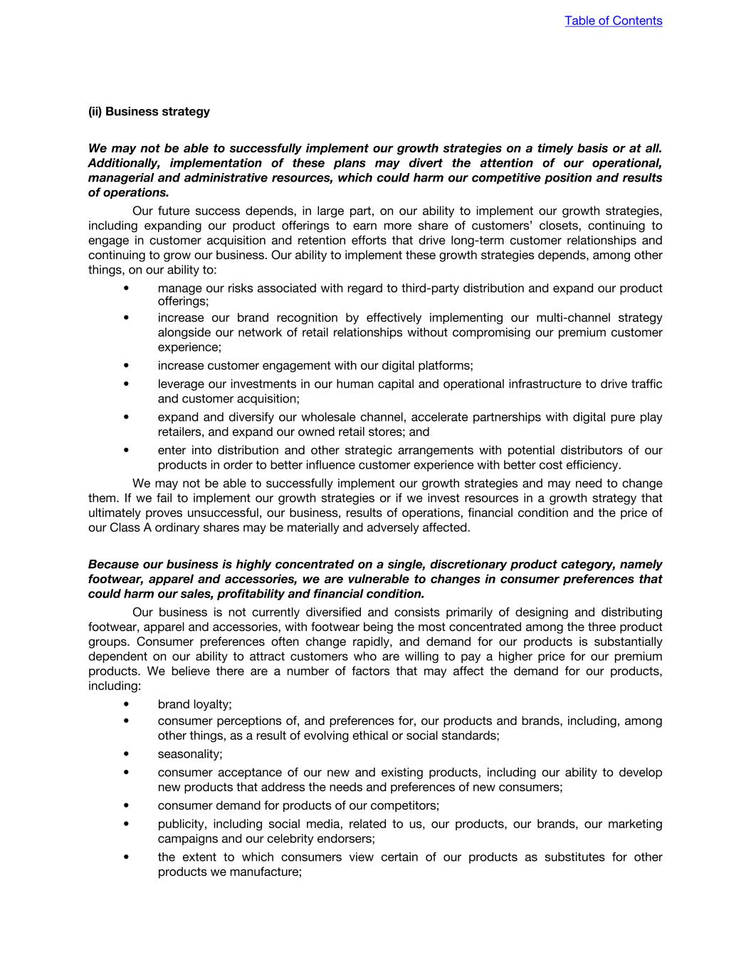 (ii) Business strategy We may not be able to successfully implement our growth strategies on a timely basis or at all. Additionally, implementation of these plans may divert the attention of our operational, managerial and administrative resources, which could harm our competitive position and results of operations. Our future success depends, in large part, on our ability to implement our growth strategies, including expanding our product offerings to earn more share of customers’ closets, continuing to engage in customer acquisition and retention efforts that drive long-term customer relationships and continuing to grow our business. Our ability to implement these growth strategies depends, among other things, on our ability to: • manage our risks associated with regard to third-party distribution and expand our product offerings; • increase our brand recognition by effectively implementing our multi-channel strategy alongside our network of retail relationships without compromising our premium customer experience; • increase customer engagement with our digital platforms; • leverage our investments in our human capital and operational infrastructure to drive traffic and customer acquisition; • expand and diversify our wholesale channel, accelerate partnerships with digital pure play retailers, and expand our owned retail stores; and • enter into distribution and other strategic arrangements with potential distributors of our products in order to better influence customer experience with better cost efficiency. We may not be able to successfully implement our growth strategies and may need to change them. If we fail to implement our growth strategies or if we invest resources in a growth strategy that ultimately proves unsuccessful, our business, results of operations, financial condition and the price of our Class A ordinary shares may be materially and adversely affected. Because our business is highly concentrated on a single, discretionary product category, namely footwear, apparel and accessories, we are vulnerable to changes in consumer preferences that could harm our sales, profitability and financial condition. Our business is not currently diversified and consists primarily of designing and distributing footwear, apparel and accessories, with footwear being the most concentrated among the three product groups. Consumer preferences often change rapidly, and demand for our products is substantially dependent on our ability to attract customers who are willing to pay a higher price for our premium products. We believe there are a number of factors that may affect the demand for our products, including: • brand loyalty; • consumer perceptions of, and preferences for, our products and brands, including, among other things, as a result of evolving ethical or social standards; • seasonality; • consumer acceptance of our new and existing products, including our ability to develop new products that address the needs and preferences of new consumers; • consumer demand for products of our competitors; • publicity, including social media, related to us, our products, our brands, our marketing campaigns and our celebrity endorsers; • the extent to which consumers view certain of our products as substitutes for other products we manufacture; Table of Contents