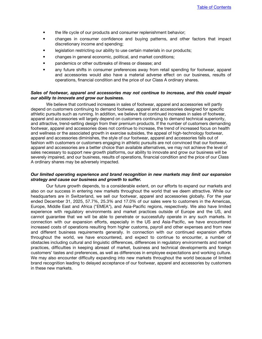 • the life cycle of our products and consumer replenishment behavior; • changes in consumer confidence and buying patterns, and other factors that impact discretionary income and spending; • legislation restricting our ability to use certain materials in our products; • changes in general economic, political, and market conditions; • pandemics or other outbreaks of illness or disease; and • any future shifts in consumer preferences away from retail spending for footwear, apparel and accessories would also have a material adverse effect on our business, results of operations, financial condition and the price of our Class A ordinary shares. Sales of footwear, apparel and accessories may not continue to increase, and this could impair our ability to innovate and grow our business. We believe that continued increases in sales of footwear, apparel and accessories will partly depend on customers continuing to demand footwear, apparel and accessories designed for specific athletic pursuits such as running. In addition, we believe that continued increases in sales of footwear, apparel and accessories will largely depend on customers continuing to demand technical superiority, and attractive, trend-setting design from their premium products. If the number of customers demanding footwear, apparel and accessories does not continue to increase, the trend of increased focus on health and wellness or the associated growth in exercise subsides, the appeal of high-technology footwear, apparel and accessories diminishes, the style of our footwear, apparel and accessories falls out of fashion with customers or customers engaging in athletic pursuits are not convinced that our footwear, apparel and accessories are a better choice than available alternatives, we may not achieve the level of sales necessary to support new growth platforms, our ability to innovate and grow our business will be severely impaired, and our business, results of operations, financial condition and the price of our Class A ordinary shares may be adversely impacted. Our limited operating experience and brand recognition in new markets may limit our expansion strategy and cause our business and growth to suffer. Our future growth depends, to a considerable extent, on our efforts to expand our markets and also on our success in entering new markets throughout the world that we deem attractive. While our headquarters are in Switzerland, we sell our footwear, apparel and accessories globally. For the year ended December 31, 2025, 57.7%, 25.3% and 17.0% of our sales were to customers in the Americas, Europe, Middle East and Africa ("EMEA"), and Asia-Pacific regions, respectively. We also have limited experience with regulatory environments and market practices outside of Europe and the US, and cannot guarantee that we will be able to penetrate or successfully operate in any such markets. In connection with our expansion efforts, especially in the US and Asia-Pacific, we have encountered increased costs of operations resulting from higher customs, payroll and other expenses and from new and different business requirements generally. In connection with our continued expansion efforts throughout the world, we have encountered, and expect to continue to encounter, a number of obstacles including cultural and linguistic differences, differences in regulatory environments and market practices, difficulties in keeping abreast of market, business and technical developments and foreign customers’ tastes and preferences, as well as differences in employee expectations and working culture. We may also encounter difficulty expanding into new markets throughout the world because of limited brand recognition leading to delayed acceptance of our footwear, apparel and accessories by customers in these new markets. Table of Contents