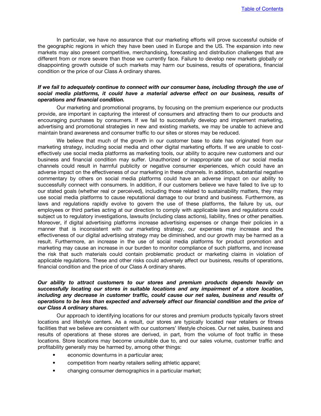 In particular, we have no assurance that our marketing efforts will prove successful outside of the geographic regions in which they have been used in Europe and the US. The expansion into new markets may also present competitive, merchandising, forecasting and distribution challenges that are different from or more severe than those we currently face. Failure to develop new markets globally or disappointing growth outside of such markets may harm our business, results of operations, financial condition or the price of our Class A ordinary shares. If we fail to adequately continue to connect with our consumer base, including through the use of social media platforms, it could have a material adverse effect on our business, results of operations and financial condition. Our marketing and promotional programs, by focusing on the premium experience our products provide, are important in capturing the interest of consumers and attracting them to our products and encouraging purchases by consumers. If we fail to successfully develop and implement marketing, advertising and promotional strategies in new and existing markets, we may be unable to achieve and maintain brand awareness and consumer traffic to our sites or stores may be reduced. We believe that much of the growth in our customer base to date has originated from our marketing strategy, including social media and other digital marketing efforts. If we are unable to cost- effectively use social media platforms as marketing tools, our ability to acquire new customers and our business and financial condition may suffer. Unauthorized or inappropriate use of our social media channels could result in harmful publicity or negative consumer experiences, which could have an adverse impact on the effectiveness of our marketing in these channels. In addition, substantial negative commentary by others on social media platforms could have an adverse impact on our ability to successfully connect with consumers. In addition, if our customers believe we have failed to live up to our stated goals (whether real or perceived), including those related to sustainability matters, they may use social media platforms to cause reputational damage to our brand and business. Furthermore, as laws and regulations rapidly evolve to govern the use of these platforms, the failure by us, our employees or third parties acting at our direction to comply with applicable laws and regulations could subject us to regulatory investigations, lawsuits (including class actions), liability, fines or other penalties. Moreover, if digital advertising platforms increase advertising expenses or change their policies in a manner that is inconsistent with our marketing strategy, our expenses may increase and the effectiveness of our digital advertising strategy may be diminished, and our growth may be harmed as a result. Furthermore, an increase in the use of social media platforms for product promotion and marketing may cause an increase in our burden to monitor compliance of such platforms, and increase the risk that such materials could contain problematic product or marketing claims in violation of applicable regulations. These and other risks could adversely affect our business, results of operations, financial condition and the price of our Class A ordinary shares. Our ability to attract customers to our stores and premium products depends heavily on successfully locating our stores in suitable locations and any impairment of a store location, including any decrease in customer traffic, could cause our net sales, business and results of operations to be less than expected and adversely affect our financial condition and the price of our Class A ordinary shares. Our approach to identifying locations for our stores and premium products typically favors street locations and lifestyle centers. As a result, our stores are typically located near retailers or fitness facilities that we believe are consistent with our customers’ lifestyle choices. Our net sales, business and results of operations at these stores are derived, in part, from the volume of foot traffic in these locations. Store locations may become unsuitable due to, and our sales volume, customer traffic and profitability generally may be harmed by, among other things: • economic downturns in a particular area; • competition from nearby retailers selling athletic apparel; • changing consumer demographics in a particular market; Table of Contents