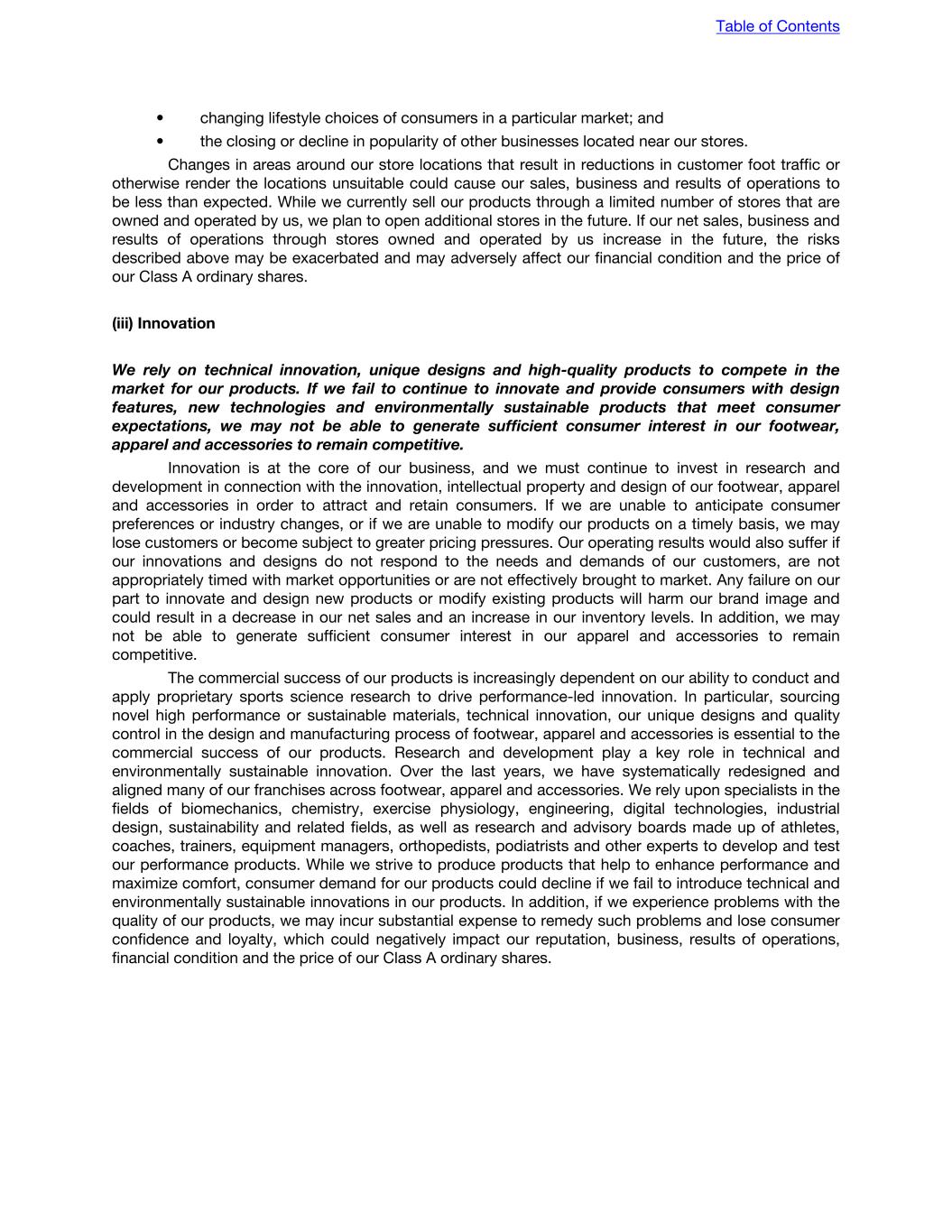 • changing lifestyle choices of consumers in a particular market; and • the closing or decline in popularity of other businesses located near our stores. Changes in areas around our store locations that result in reductions in customer foot traffic or otherwise render the locations unsuitable could cause our sales, business and results of operations to be less than expected. While we currently sell our products through a limited number of stores that are owned and operated by us, we plan to open additional stores in the future. If our net sales, business and results of operations through stores owned and operated by us increase in the future, the risks described above may be exacerbated and may adversely affect our financial condition and the price of our Class A ordinary shares. (iii) Innovation We rely on technical innovation, unique designs and high-quality products to compete in the market for our products. If we fail to continue to innovate and provide consumers with design features, new technologies and environmentally sustainable products that meet consumer expectations, we may not be able to generate sufficient consumer interest in our footwear, apparel and accessories to remain competitive. Innovation is at the core of our business, and we must continue to invest in research and development in connection with the innovation, intellectual property and design of our footwear, apparel and accessories in order to attract and retain consumers. If we are unable to anticipate consumer preferences or industry changes, or if we are unable to modify our products on a timely basis, we may lose customers or become subject to greater pricing pressures. Our operating results would also suffer if our innovations and designs do not respond to the needs and demands of our customers, are not appropriately timed with market opportunities or are not effectively brought to market. Any failure on our part to innovate and design new products or modify existing products will harm our brand image and could result in a decrease in our net sales and an increase in our inventory levels. In addition, we may not be able to generate sufficient consumer interest in our apparel and accessories to remain competitive. The commercial success of our products is increasingly dependent on our ability to conduct and apply proprietary sports science research to drive performance-led innovation. In particular, sourcing novel high performance or sustainable materials, technical innovation, our unique designs and quality control in the design and manufacturing process of footwear, apparel and accessories is essential to the commercial success of our products. Research and development play a key role in technical and environmentally sustainable innovation. Over the last years, we have systematically redesigned and aligned many of our franchises across footwear, apparel and accessories. We rely upon specialists in the fields of biomechanics, chemistry, exercise physiology, engineering, digital technologies, industrial design, sustainability and related fields, as well as research and advisory boards made up of athletes, coaches, trainers, equipment managers, orthopedists, podiatrists and other experts to develop and test our performance products. While we strive to produce products that help to enhance performance and maximize comfort, consumer demand for our products could decline if we fail to introduce technical and environmentally sustainable innovations in our products. In addition, if we experience problems with the quality of our products, we may incur substantial expense to remedy such problems and lose consumer confidence and loyalty, which could negatively impact our reputation, business, results of operations, financial condition and the price of our Class A ordinary shares. Table of Contents