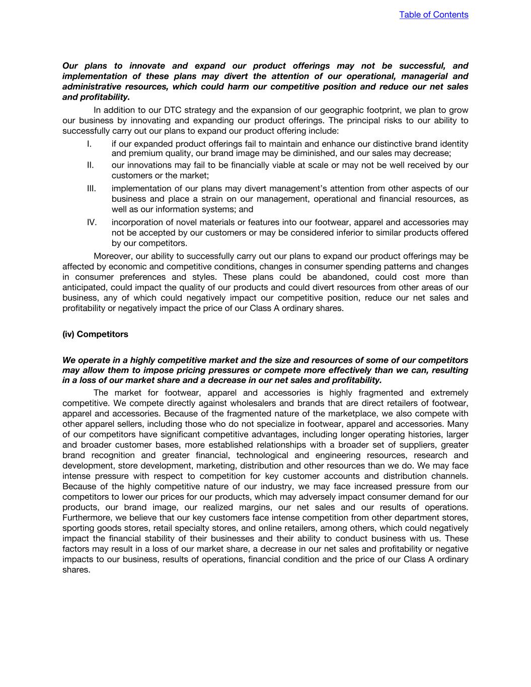 Our plans to innovate and expand our product offerings may not be successful, and implementation of these plans may divert the attention of our operational, managerial and administrative resources, which could harm our competitive position and reduce our net sales and profitability. In addition to our DTC strategy and the expansion of our geographic footprint, we plan to grow our business by innovating and expanding our product offerings. The principal risks to our ability to successfully carry out our plans to expand our product offering include: I. if our expanded product offerings fail to maintain and enhance our distinctive brand identity and premium quality, our brand image may be diminished, and our sales may decrease; II. our innovations may fail to be financially viable at scale or may not be well received by our customers or the market; III. implementation of our plans may divert management’s attention from other aspects of our business and place a strain on our management, operational and financial resources, as well as our information systems; and IV. incorporation of novel materials or features into our footwear, apparel and accessories may not be accepted by our customers or may be considered inferior to similar products offered by our competitors. Moreover, our ability to successfully carry out our plans to expand our product offerings may be affected by economic and competitive conditions, changes in consumer spending patterns and changes in consumer preferences and styles. These plans could be abandoned, could cost more than anticipated, could impact the quality of our products and could divert resources from other areas of our business, any of which could negatively impact our competitive position, reduce our net sales and profitability or negatively impact the price of our Class A ordinary shares. (iv) Competitors We operate in a highly competitive market and the size and resources of some of our competitors may allow them to impose pricing pressures or compete more effectively than we can, resulting in a loss of our market share and a decrease in our net sales and profitability. The market for footwear, apparel and accessories is highly fragmented and extremely competitive. We compete directly against wholesalers and brands that are direct retailers of footwear, apparel and accessories. Because of the fragmented nature of the marketplace, we also compete with other apparel sellers, including those who do not specialize in footwear, apparel and accessories. Many of our competitors have significant competitive advantages, including longer operating histories, larger and broader customer bases, more established relationships with a broader set of suppliers, greater brand recognition and greater financial, technological and engineering resources, research and development, store development, marketing, distribution and other resources than we do. We may face intense pressure with respect to competition for key customer accounts and distribution channels. Because of the highly competitive nature of our industry, we may face increased pressure from our competitors to lower our prices for our products, which may adversely impact consumer demand for our products, our brand image, our realized margins, our net sales and our results of operations. Furthermore, we believe that our key customers face intense competition from other department stores, sporting goods stores, retail specialty stores, and online retailers, among others, which could negatively impact the financial stability of their businesses and their ability to conduct business with us. These factors may result in a loss of our market share, a decrease in our net sales and profitability or negative impacts to our business, results of operations, financial condition and the price of our Class A ordinary shares. Table of Contents
