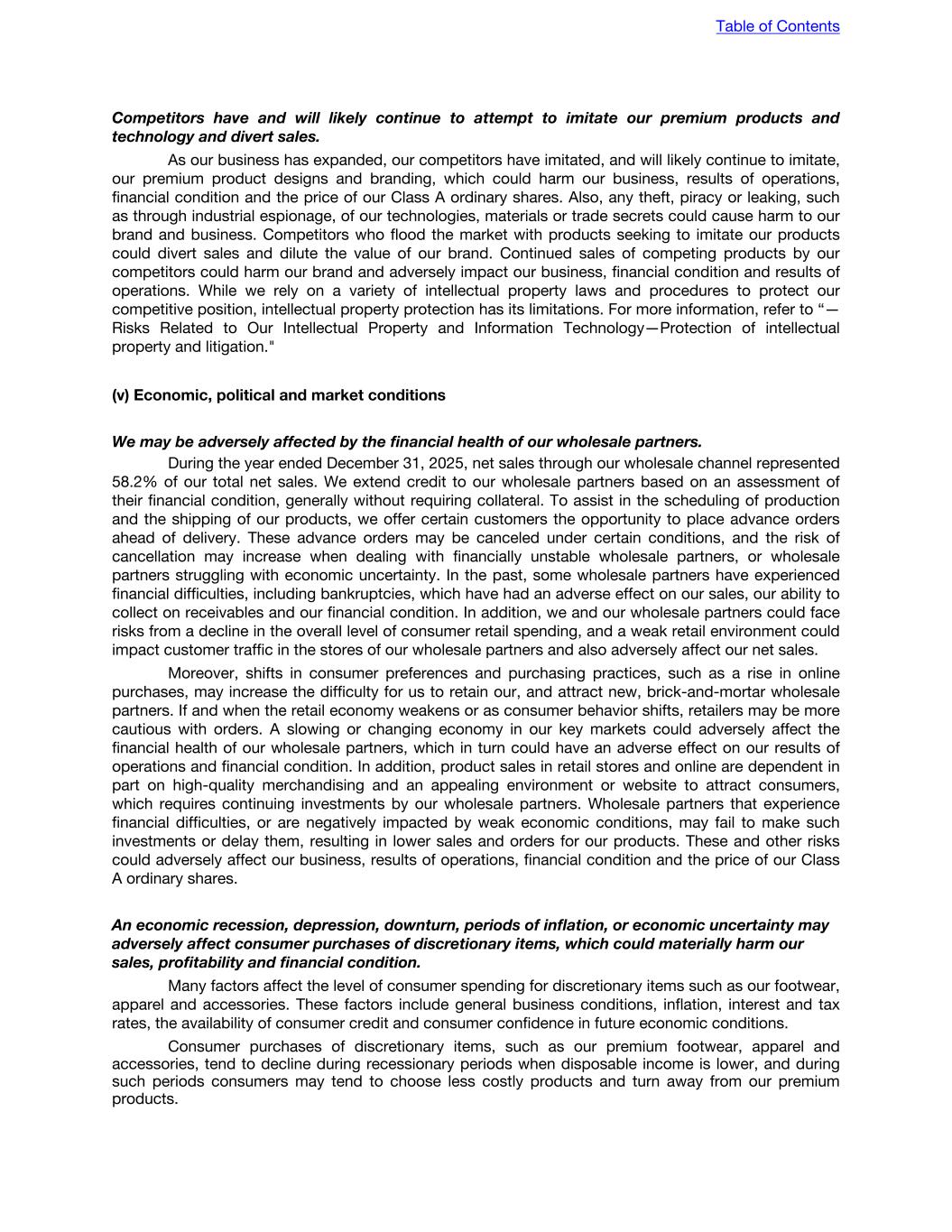 Competitors have and will likely continue to attempt to imitate our premium products and technology and divert sales. As our business has expanded, our competitors have imitated, and will likely continue to imitate, our premium product designs and branding, which could harm our business, results of operations, financial condition and the price of our Class A ordinary shares. Also, any theft, piracy or leaking, such as through industrial espionage, of our technologies, materials or trade secrets could cause harm to our brand and business. Competitors who flood the market with products seeking to imitate our products could divert sales and dilute the value of our brand. Continued sales of competing products by our competitors could harm our brand and adversely impact our business, financial condition and results of operations. While we rely on a variety of intellectual property laws and procedures to protect our competitive position, intellectual property protection has its limitations. For more information, refer to “— Risks Related to Our Intellectual Property and Information Technology—Protection of intellectual property and litigation." (v) Economic, political and market conditions We may be adversely affected by the financial health of our wholesale partners. During the year ended December 31, 2025, net sales through our wholesale channel represented 58.2% of our total net sales. We extend credit to our wholesale partners based on an assessment of their financial condition, generally without requiring collateral. To assist in the scheduling of production and the shipping of our products, we offer certain customers the opportunity to place advance orders ahead of delivery. These advance orders may be canceled under certain conditions, and the risk of cancellation may increase when dealing with financially unstable wholesale partners, or wholesale partners struggling with economic uncertainty. In the past, some wholesale partners have experienced financial difficulties, including bankruptcies, which have had an adverse effect on our sales, our ability to collect on receivables and our financial condition. In addition, we and our wholesale partners could face risks from a decline in the overall level of consumer retail spending, and a weak retail environment could impact customer traffic in the stores of our wholesale partners and also adversely affect our net sales. Moreover, shifts in consumer preferences and purchasing practices, such as a rise in online purchases, may increase the difficulty for us to retain our, and attract new, brick-and-mortar wholesale partners. If and when the retail economy weakens or as consumer behavior shifts, retailers may be more cautious with orders. A slowing or changing economy in our key markets could adversely affect the financial health of our wholesale partners, which in turn could have an adverse effect on our results of operations and financial condition. In addition, product sales in retail stores and online are dependent in part on high-quality merchandising and an appealing environment or website to attract consumers, which requires continuing investments by our wholesale partners. Wholesale partners that experience financial difficulties, or are negatively impacted by weak economic conditions, may fail to make such investments or delay them, resulting in lower sales and orders for our products. These and other risks could adversely affect our business, results of operations, financial condition and the price of our Class A ordinary shares. An economic recession, depression, downturn, periods of inflation, or economic uncertainty may adversely affect consumer purchases of discretionary items, which could materially harm our sales, profitability and financial condition. Many factors affect the level of consumer spending for discretionary items such as our footwear, apparel and accessories. These factors include general business conditions, inflation, interest and tax rates, the availability of consumer credit and consumer confidence in future economic conditions. Consumer purchases of discretionary items, such as our premium footwear, apparel and accessories, tend to decline during recessionary periods when disposable income is lower, and during such periods consumers may tend to choose less costly products and turn away from our premium products. Table of Contents