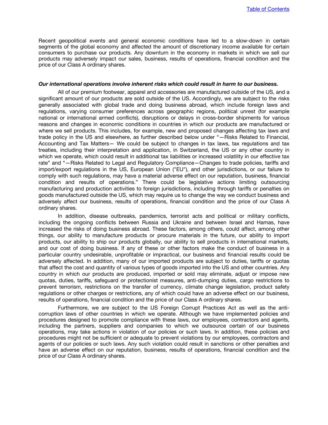 Recent geopolitical events and general economic conditions have led to a slow-down in certain segments of the global economy and affected the amount of discretionary income available for certain consumers to purchase our products. Any downturn in the economy in markets in which we sell our products may adversely impact our sales, business, results of operations, financial condition and the price of our Class A ordinary shares. Our international operations involve inherent risks which could result in harm to our business. All of our premium footwear, apparel and accessories are manufactured outside of the US, and a significant amount of our products are sold outside of the US. Accordingly, we are subject to the risks generally associated with global trade and doing business abroad, which include foreign laws and regulations, varying consumer preferences across geographic regions, political unrest (for example national or international armed conflicts), disruptions or delays in cross-border shipments for various reasons and changes in economic conditions in countries in which our products are manufactured or where we sell products. This includes, for example, new and proposed changes affecting tax laws and trade policy in the US and elsewhere, as further described below under “—Risks Related to Financial, Accounting and Tax Matters— We could be subject to changes in tax laws, tax regulations and tax treaties, including their interpretation and application, in Switzerland, the US or any other country in which we operate, which could result in additional tax liabilities or increased volatility in our effective tax rate” and “—Risks Related to Legal and Regulatory Compliance—Changes to trade policies, tariffs and import/export regulations in the US, European Union ("EU"), and other jurisdictions, or our failure to comply with such regulations, may have a material adverse effect on our reputation, business, financial condition and results of operations.” There could be legislative actions limiting outsourcing manufacturing and production activities to foreign jurisdictions, including through tariffs or penalties on goods manufactured outside the US, which may require us to change the way we conduct business and adversely affect our business, results of operations, financial condition and the price of our Class A ordinary shares. In addition, disease outbreaks, pandemics, terrorist acts and political or military conflicts, including the ongoing conflicts between Russia and Ukraine and between Israel and Hamas, have increased the risks of doing business abroad. These factors, among others, could affect, among other things, our ability to manufacture products or procure materials in the future, our ability to import products, our ability to ship our products globally, our ability to sell products in international markets, and our cost of doing business. If any of these or other factors make the conduct of business in a particular country undesirable, unprofitable or impractical, our business and financial results could be adversely affected. In addition, many of our imported products are subject to duties, tariffs or quotas that affect the cost and quantity of various types of goods imported into the US and other countries. Any country in which our products are produced, imported or sold may eliminate, adjust or impose new quotas, duties, tariffs, safeguard or protectionist measures, anti-dumping duties, cargo restrictions to prevent terrorism, restrictions on the transfer of currency, climate change legislation, product safety regulations or other charges or restrictions, any of which could have an adverse effect on our business, results of operations, financial condition and the price of our Class A ordinary shares. Furthermore, we are subject to the US Foreign Corrupt Practices Act as well as the anti- corruption laws of other countries in which we operate. Although we have implemented policies and procedures designed to promote compliance with these laws, our employees, contractors and agents, including the partners, suppliers and companies to which we outsource certain of our business operations, may take actions in violation of our policies or such laws. In addition, these policies and procedures might not be sufficient or adequate to prevent violations by our employees, contractors and agents of our policies or such laws. Any such violation could result in sanctions or other penalties and have an adverse effect on our reputation, business, results of operations, financial condition and the price of our Class A ordinary shares. Table of Contents