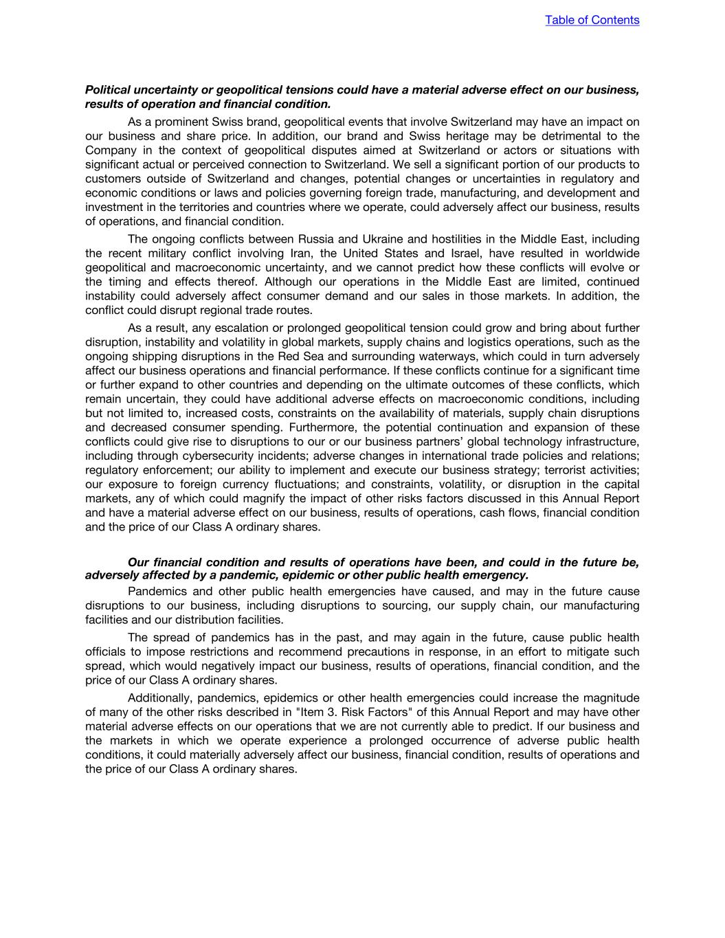 Political uncertainty or geopolitical tensions could have a material adverse effect on our business, results of operation and financial condition. As a prominent Swiss brand, geopolitical events that involve Switzerland may have an impact on our business and share price. In addition, our brand and Swiss heritage may be detrimental to the Company in the context of geopolitical disputes aimed at Switzerland or actors or situations with significant actual or perceived connection to Switzerland. We sell a significant portion of our products to customers outside of Switzerland and changes, potential changes or uncertainties in regulatory and economic conditions or laws and policies governing foreign trade, manufacturing, and development and investment in the territories and countries where we operate, could adversely affect our business, results of operations, and financial condition. The ongoing conflicts between Russia and Ukraine and hostilities in the Middle East, including the recent military conflict involving Iran, the United States and Israel, have resulted in worldwide geopolitical and macroeconomic uncertainty, and we cannot predict how these conflicts will evolve or the timing and effects thereof. Although our operations in the Middle East are limited, continued instability could adversely affect consumer demand and our sales in those markets. In addition, the conflict could disrupt regional trade routes. As a result, any escalation or prolonged geopolitical tension could grow and bring about further disruption, instability and volatility in global markets, supply chains and logistics operations, such as the ongoing shipping disruptions in the Red Sea and surrounding waterways, which could in turn adversely affect our business operations and financial performance. If these conflicts continue for a significant time or further expand to other countries and depending on the ultimate outcomes of these conflicts, which remain uncertain, they could have additional adverse effects on macroeconomic conditions, including but not limited to, increased costs, constraints on the availability of materials, supply chain disruptions and decreased consumer spending. Furthermore, the potential continuation and expansion of these conflicts could give rise to disruptions to our or our business partners’ global technology infrastructure, including through cybersecurity incidents; adverse changes in international trade policies and relations; regulatory enforcement; our ability to implement and execute our business strategy; terrorist activities; our exposure to foreign currency fluctuations; and constraints, volatility, or disruption in the capital markets, any of which could magnify the impact of other risks factors discussed in this Annual Report and have a material adverse effect on our business, results of operations, cash flows, financial condition and the price of our Class A ordinary shares. Our financial condition and results of operations have been, and could in the future be, adversely affected by a pandemic, epidemic or other public health emergency. Pandemics and other public health emergencies have caused, and may in the future cause disruptions to our business, including disruptions to sourcing, our supply chain, our manufacturing facilities and our distribution facilities. The spread of pandemics has in the past, and may again in the future, cause public health officials to impose restrictions and recommend precautions in response, in an effort to mitigate such spread, which would negatively impact our business, results of operations, financial condition, and the price of our Class A ordinary shares. Additionally, pandemics, epidemics or other health emergencies could increase the magnitude of many of the other risks described in "Item 3. Risk Factors" of this Annual Report and may have other material adverse effects on our operations that we are not currently able to predict. If our business and the markets in which we operate experience a prolonged occurrence of adverse public health conditions, it could materially adversely affect our business, financial condition, results of operations and the price of our Class A ordinary shares. Table of Contents